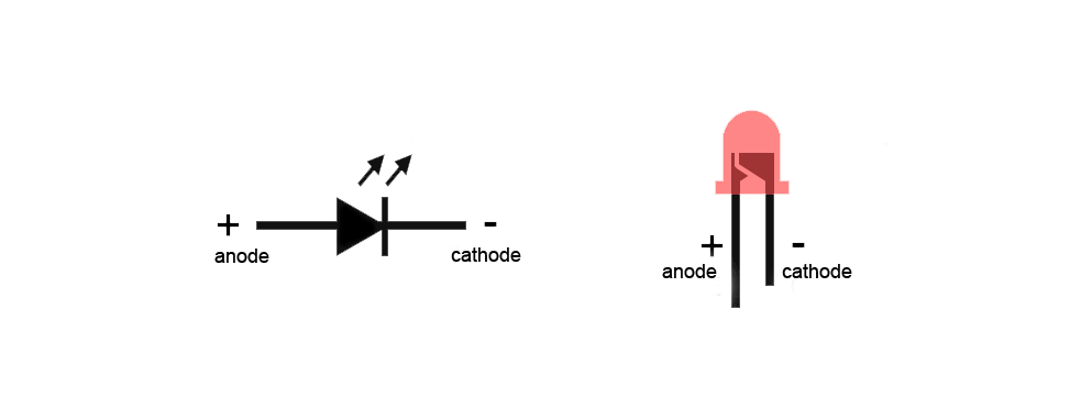 LED stands for light emitting diode, and diodes are devices that have a polarity. The positive terminal is called the anode, and the negative terminal is called the cathode. The short leg is the cathode, and the long leg is the anode. But don't worry: if you wire up an LED correctly and just get the polarity wrong, nothing happens. It just won't glow. In that case just switch the plus and minus cables and then everything will be alright. But don't forget the current limiting resistor that we will talk about next!