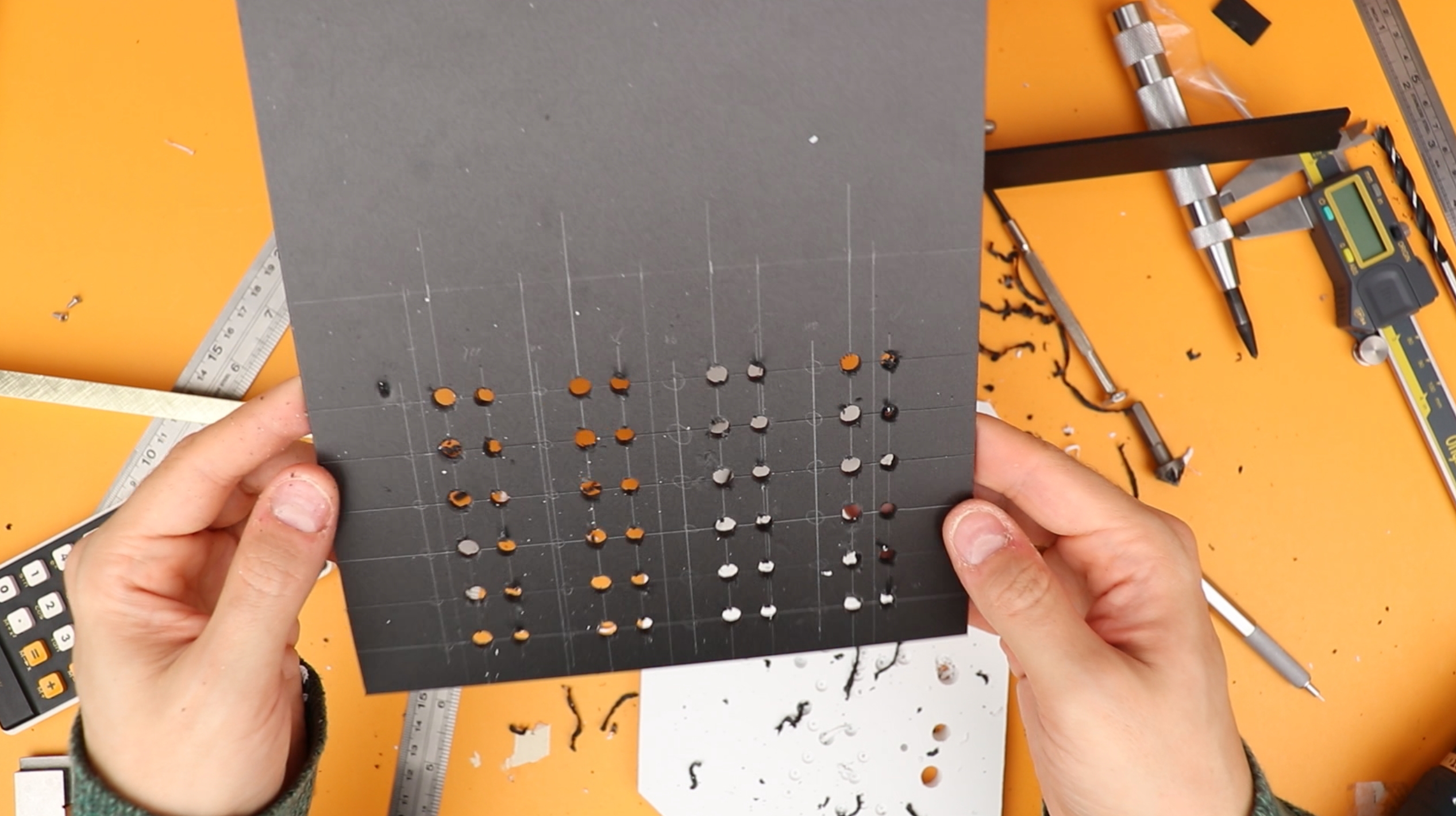 I started out by measuring the panel meter, switches, and LEDs, and then played around a bit until I found a layout I liked where everything was spaced more or less evenly.