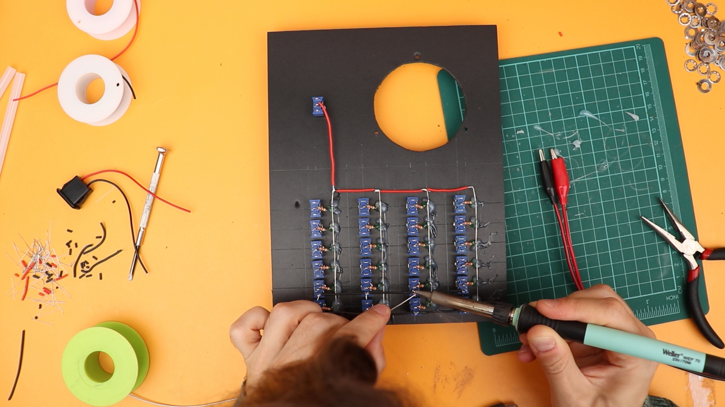 The main idea of the calendar is simple: every day, we turn on an additional LED. When we connect all of these LEDs in parallel, then the total current that flows through this circuit gets bigger the more LEDs are turned on.