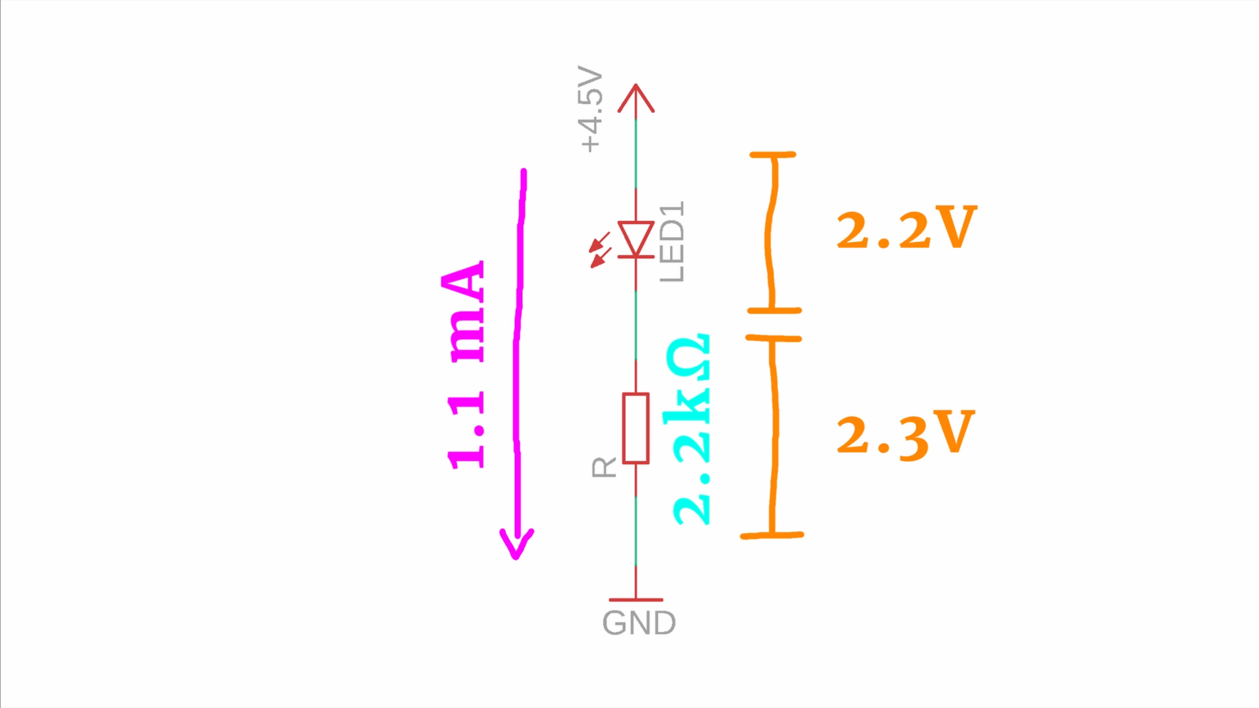 The forward voltage across the LED is still 2.2 volts, that never changes, but the voltage across the resistor is now only 2.3 volts. And, when we use Ohm's law again (and we will see it a bunch more today), we find that the current is now only 1.1 milli amps. This is smaller than what we got before, and it would make the LED shine not as bright. So: same resistor, but: different current. All because the operating voltage changed.