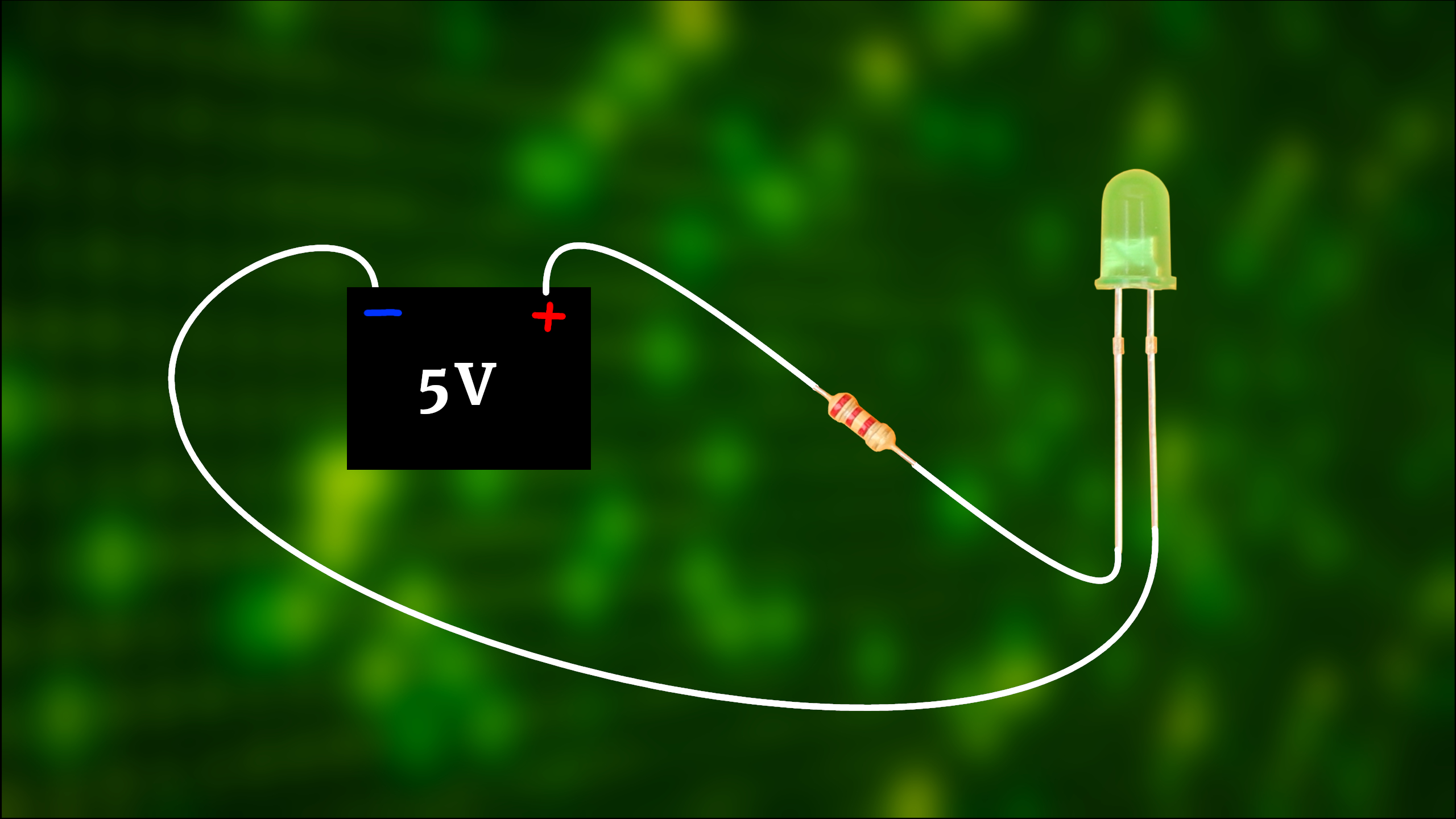 If we want to run an LED at a fixed power supply voltage, like 5V in our example today, we need to limit the current, and a simple way to do that is to use a resistor in a circuit like this:
