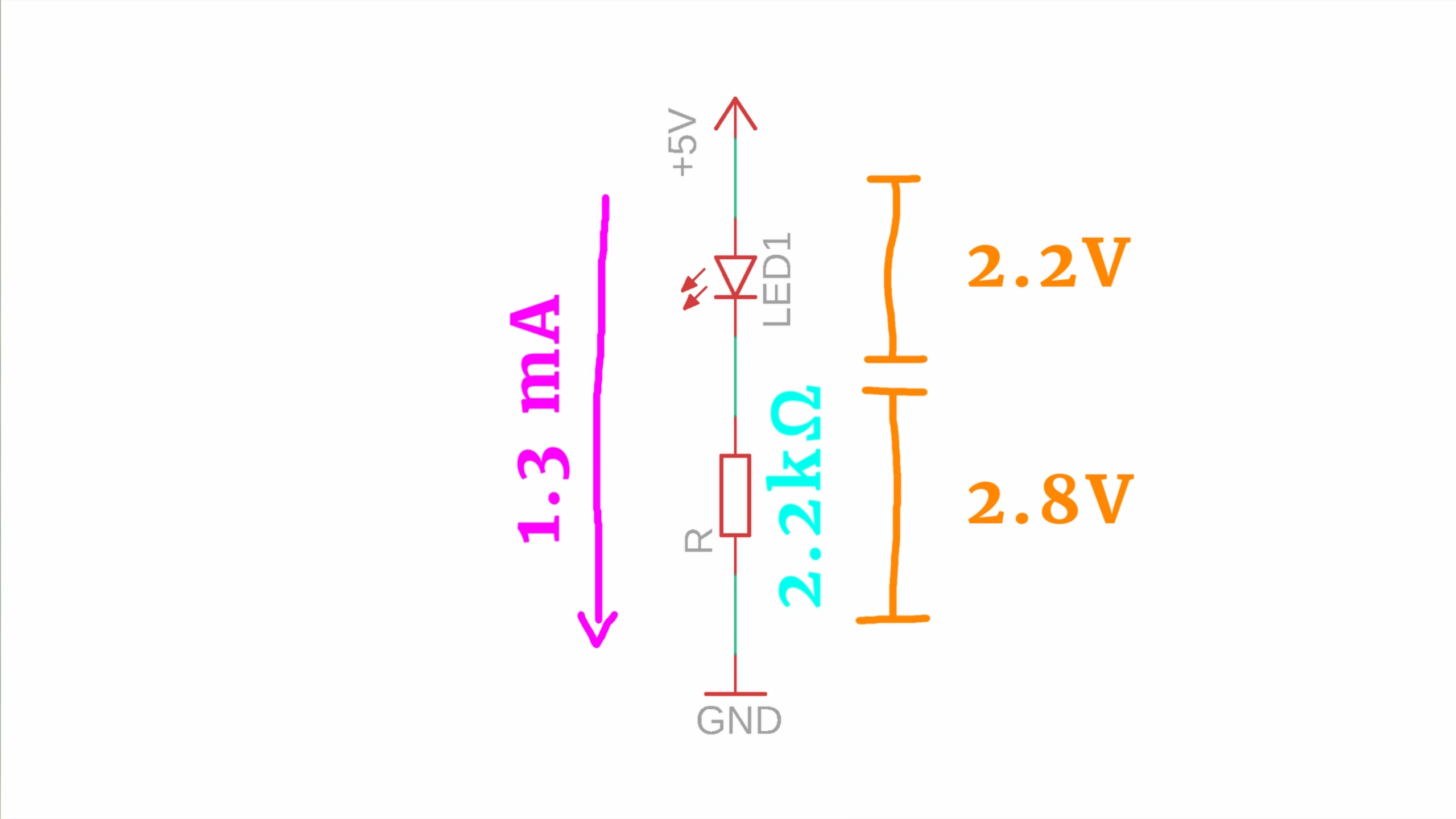 So, we can take again Ohm's law and calculate, this time for the current, that it will be 2.8V/2.2kΩ which is around 1.3mA. And that is still perfectly fine for our LEDs.