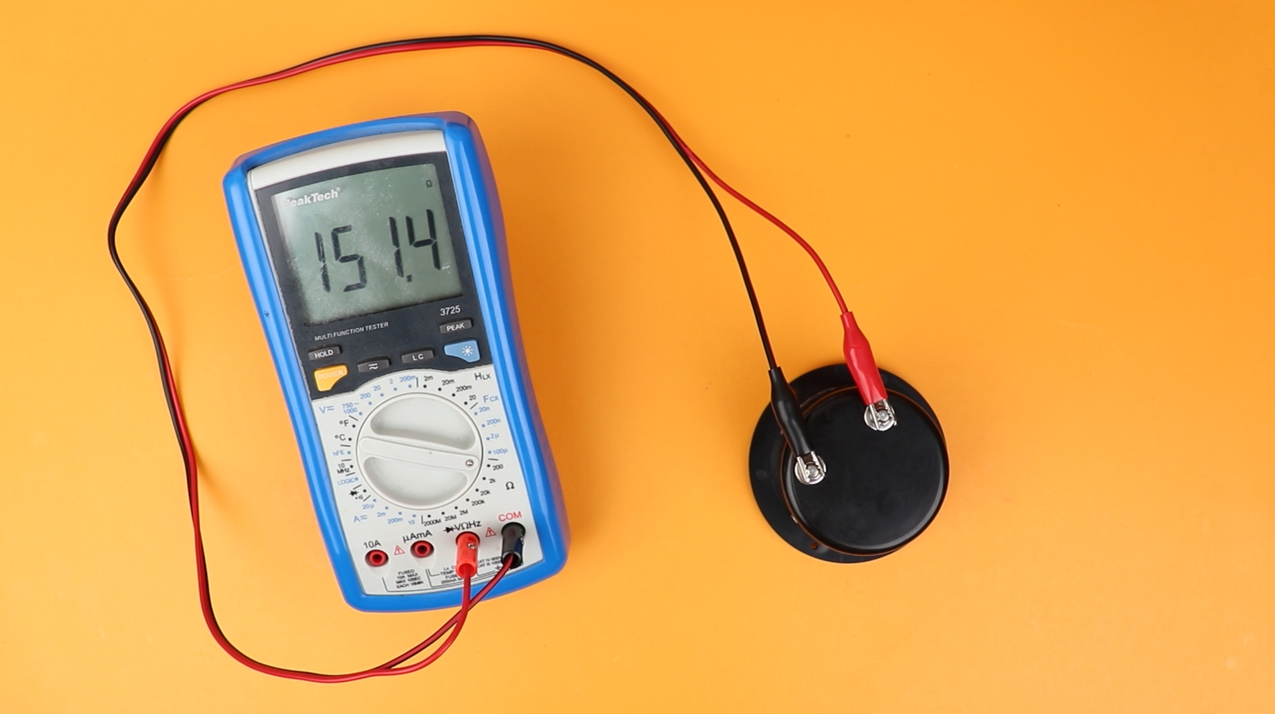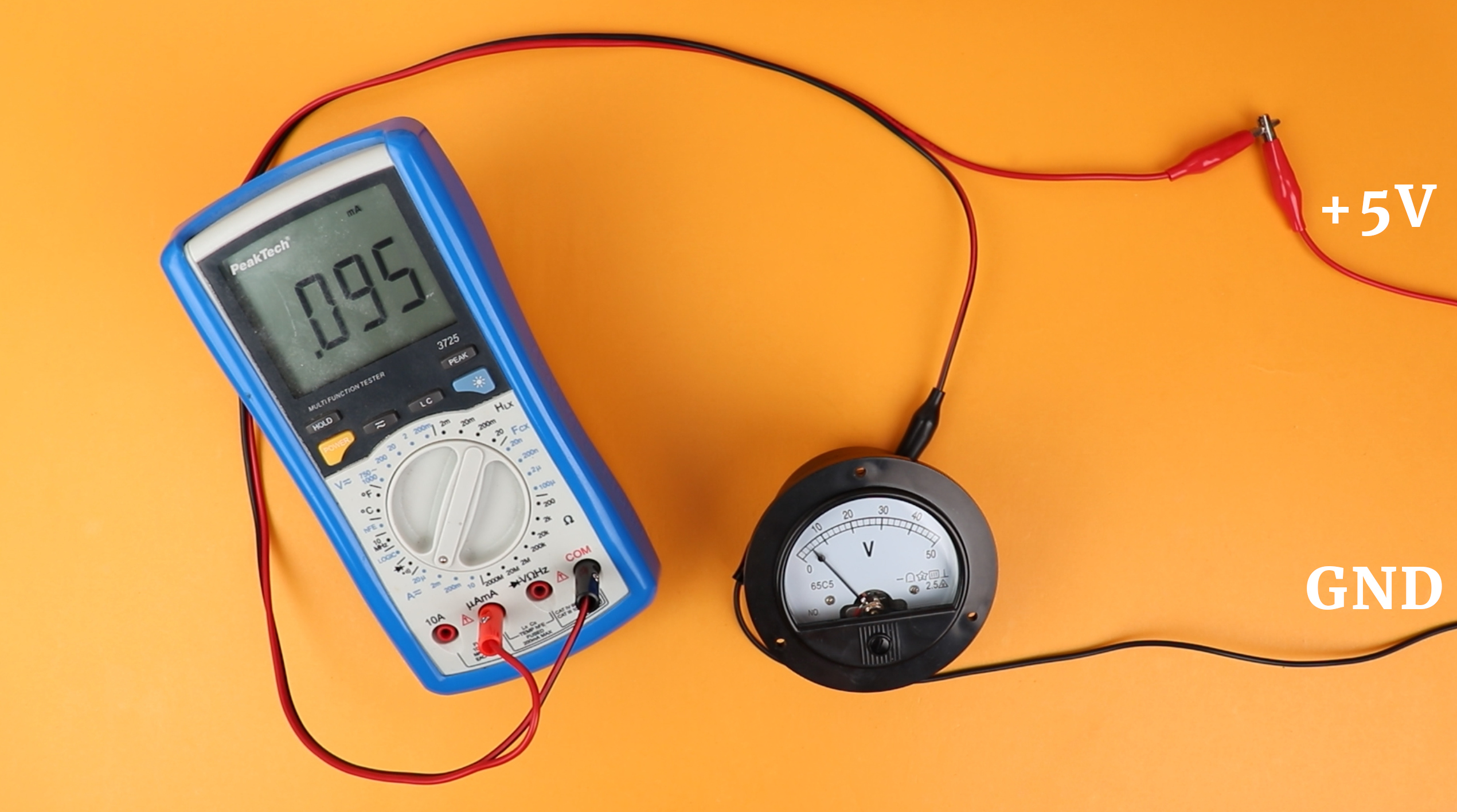 This means that we can measure the saturation current really easily. For our example today, we just measure the current with our multimeter. We connect it in series with the panel meter, and apply 5 V which fills out 10% of the scale.