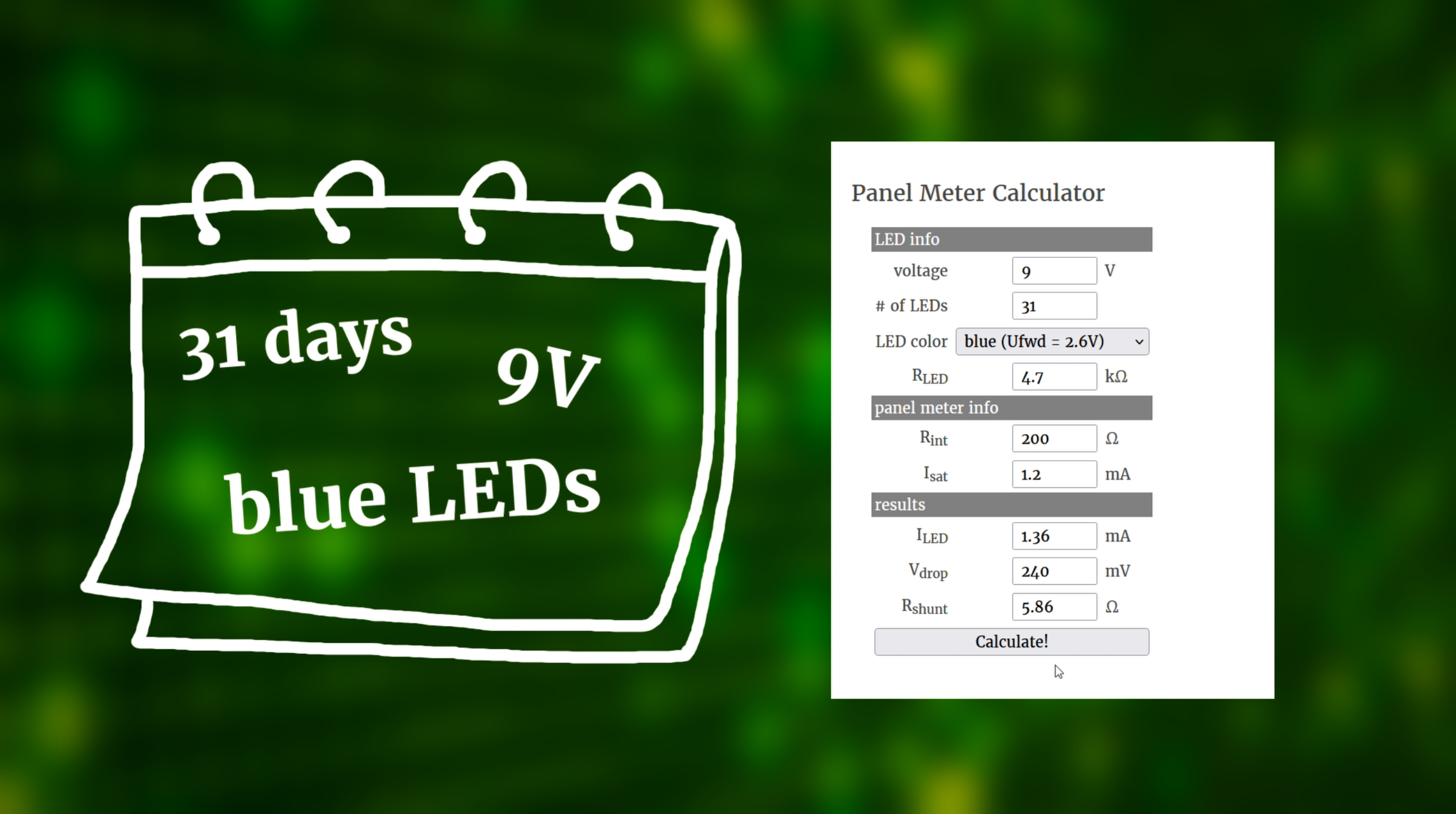 Let us say you want a calendar that has 31 days, and you want to drive it at 9V, not 5V, and work with blue LEDs instead. You put that into the calculator, and then you also need to give an LED resistor value, and you can play around with it a bit, but I think around 4.7kΩ is a good choice. And then you input the internal resistance and the saturation current for your panel meter, and click on “Calculate.” The calculator then shows you three numbers: the LED current, and you can use that information to play a bit with the LED resistor value; the voltage drop, which should not be too large, and less than 0.3V should be OK; and of course also the shunt resistor value.