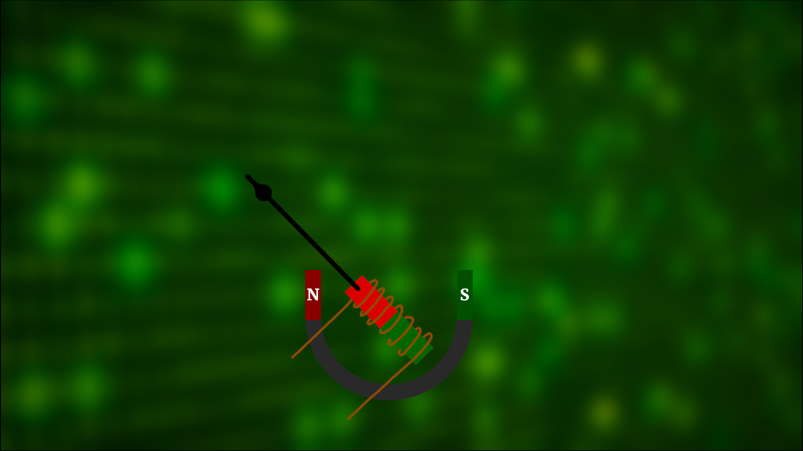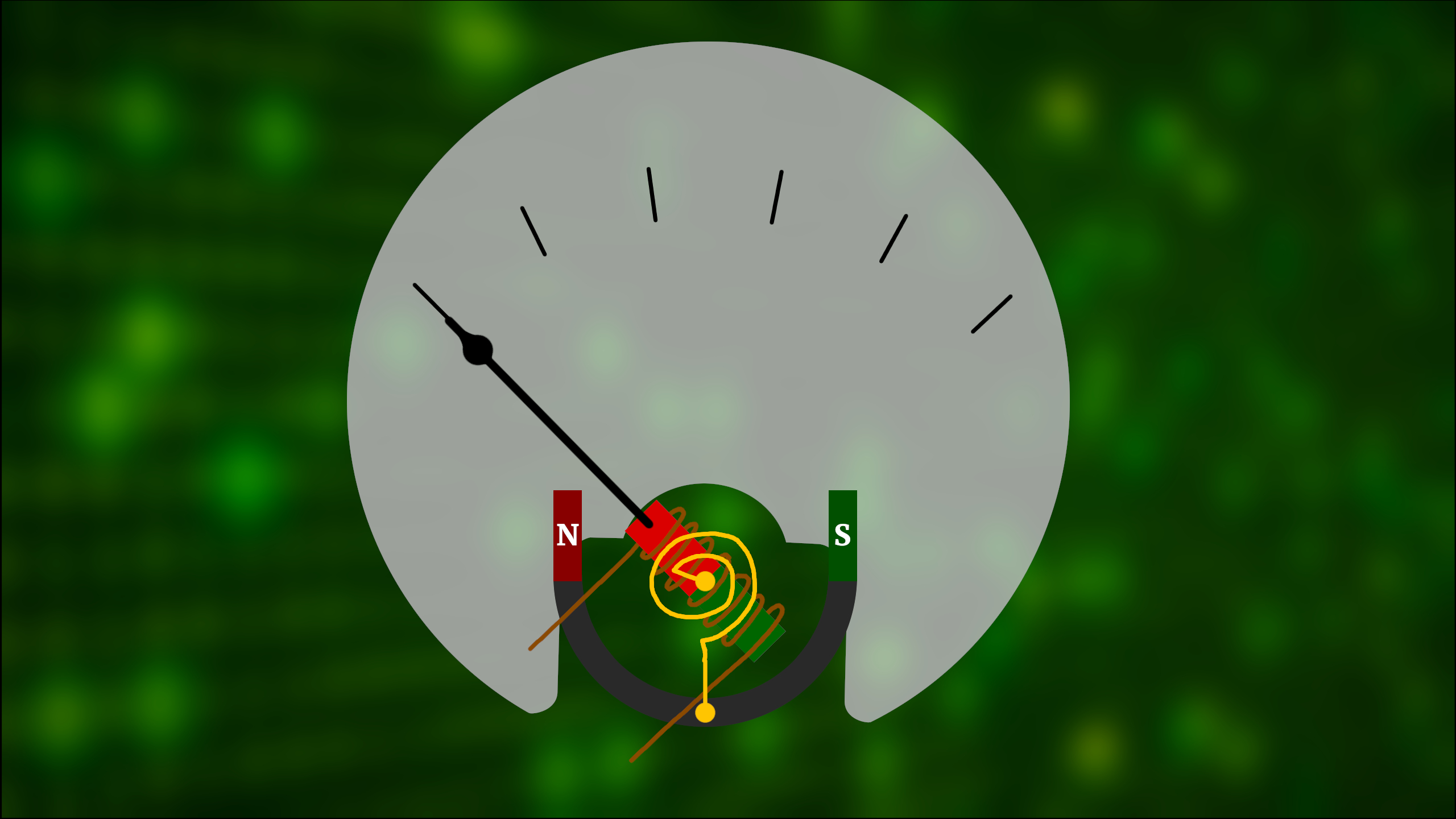 When we send an electric current through the coil, the electromagnet turns on and the needle starts to move, but now the spring tries to pull the needle back into the initial position. The more the needle moves, the stronger the spring pulls, until the forces of the magnets and that of the spring cancel each other, and we reach a point where the needle stops to turn. If the flowing current is bigger, the same thing happens, just further down the scale, because the magnetic repulsion is stronger. And if the current is smaller, the needle ends up further left on the scale.