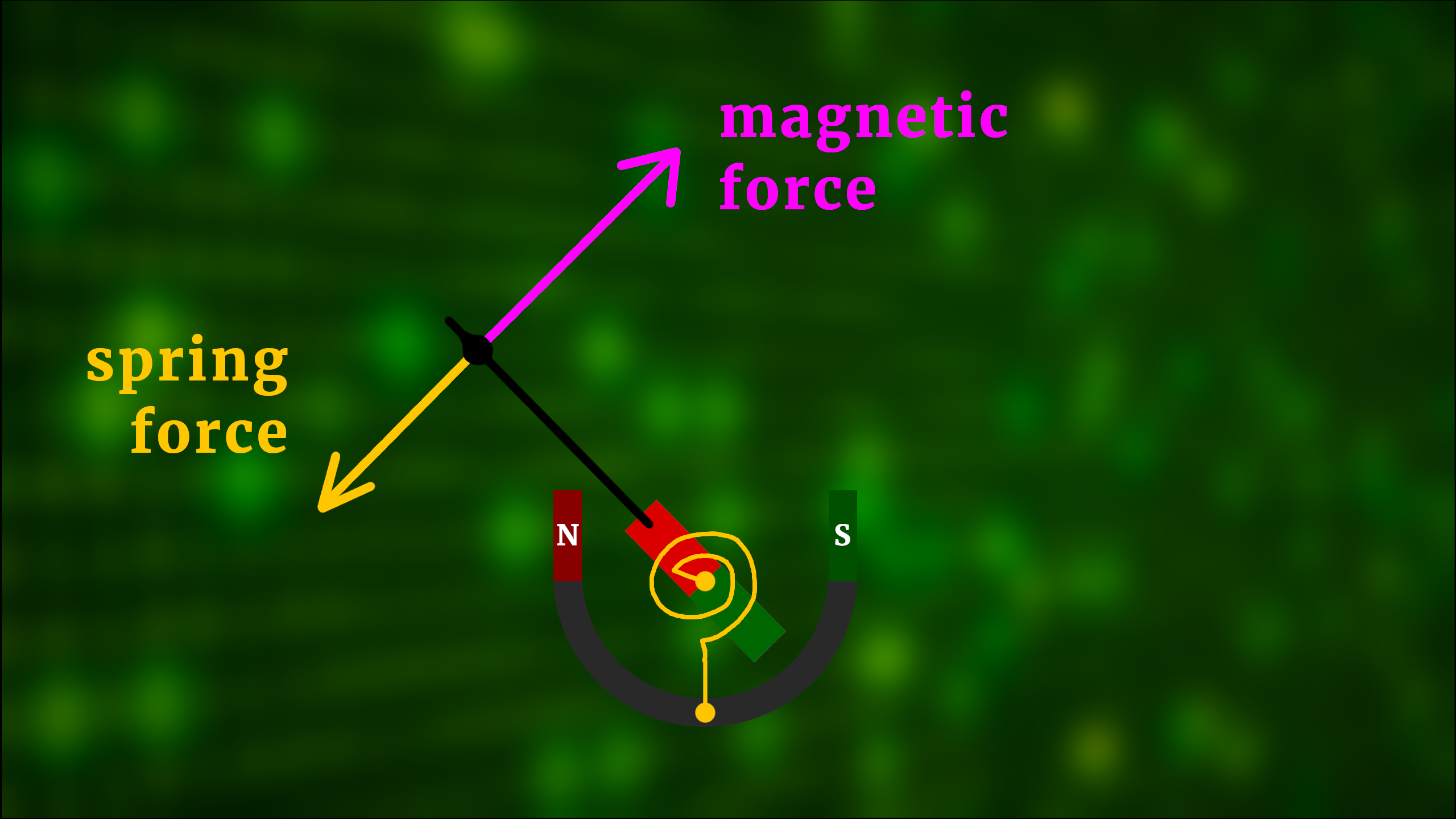 But that alone is still not enough, because this way the coil would just spin until the magnets align perfectly and then stay there forever, not good. This is where the spring comes in: