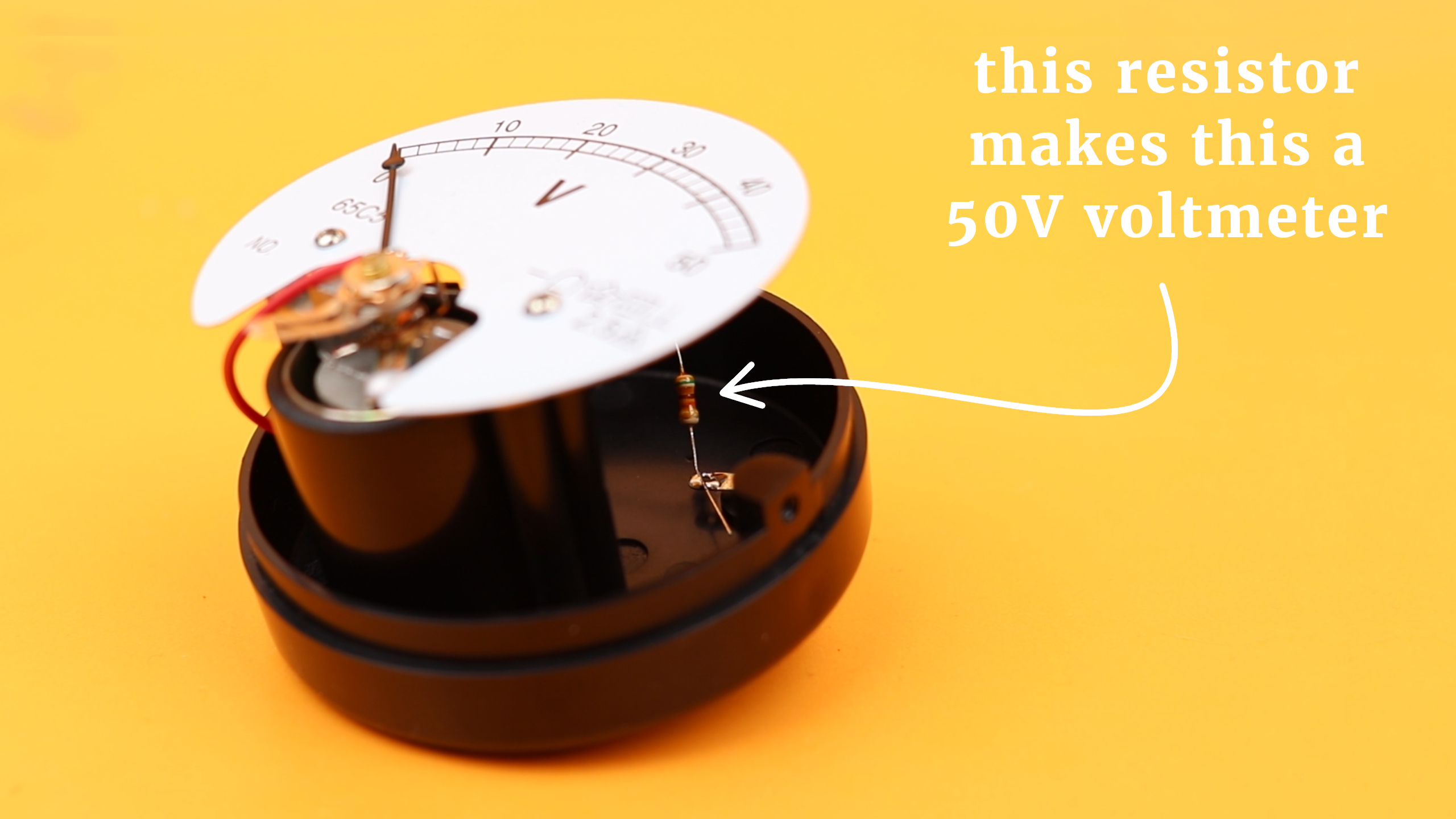 This is a bit confusing, my apologies. This resistor that we see here is connected in series with the coil of the panel meter, and it is not the internal resistance we are after. Why is it here? It actually makes this a 50V panel meter, and if you want to learn more about it, you can read all about in Chapter 4 of the project article about the analog clock.