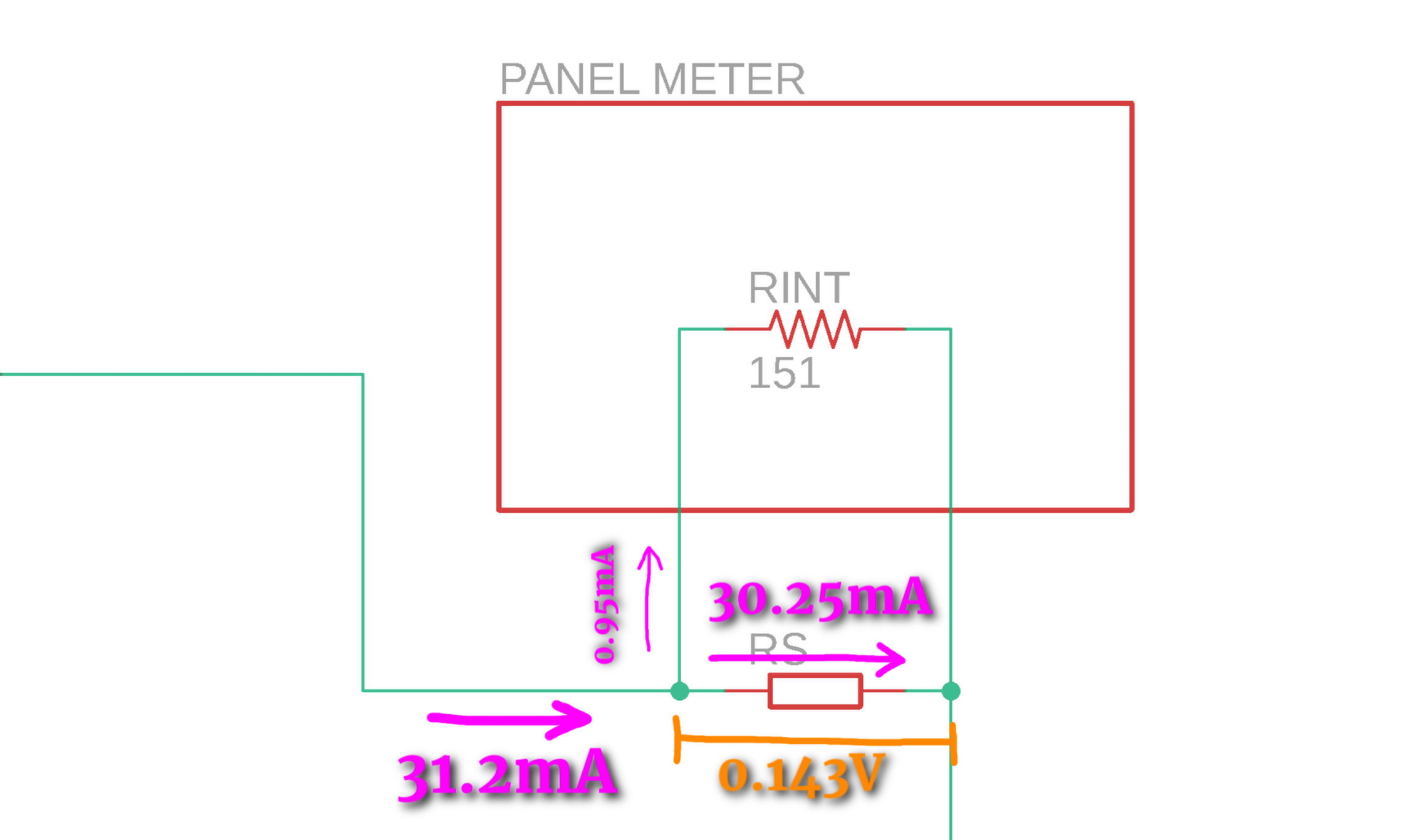 So the idea is to divide the current and make sure that when the total current of 31.2mA flows, only the saturation current of 0.95mA flows into the panel meter. What we need is a current divider, and that's exactly what the shunt resistor does: