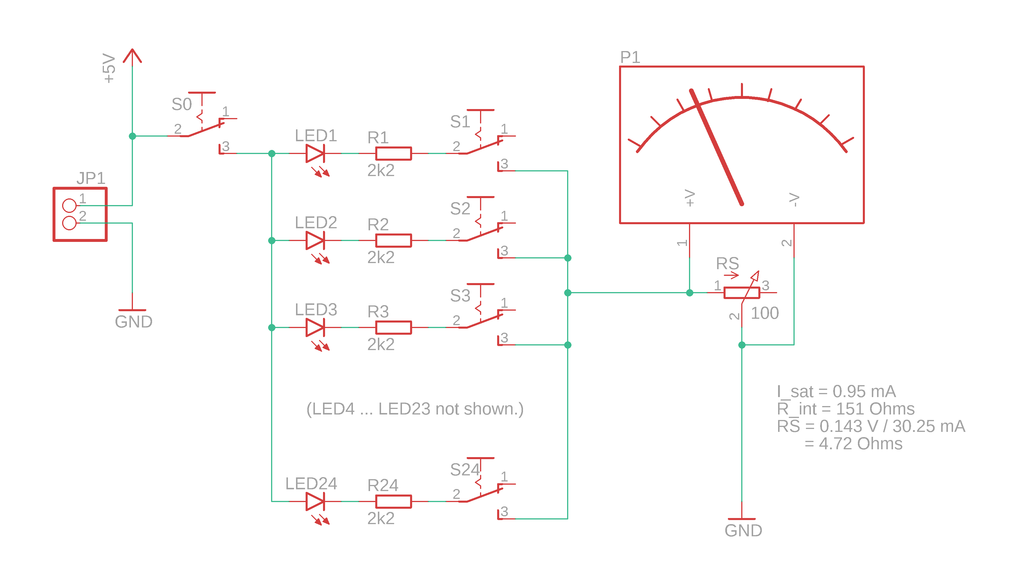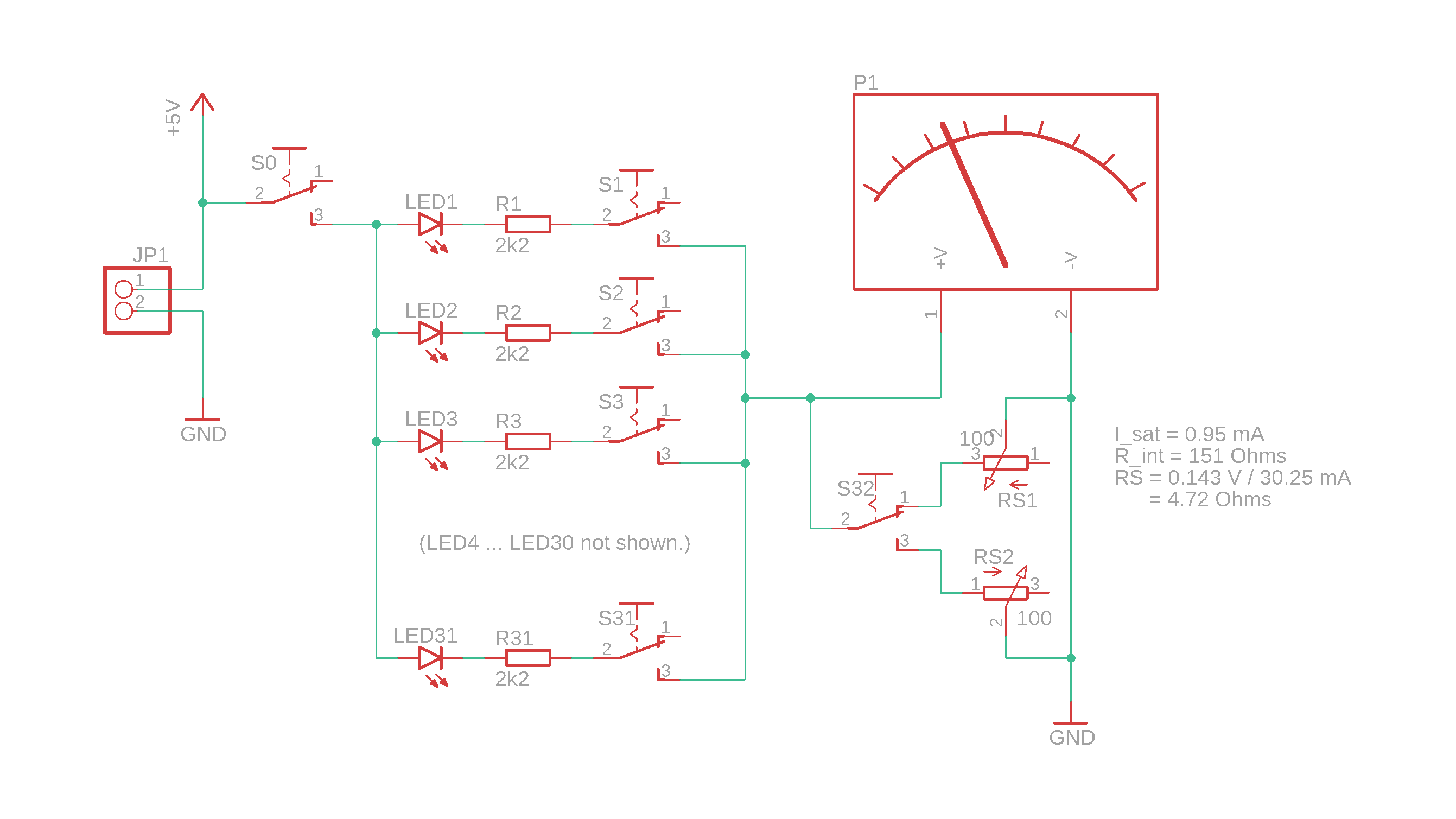Let's say you measured an Rint of 200Ω and a saturation current of 1.2mA. Then, with the numbers as above, you would get an RS of 5.86Ω. The bottom line is: for most cases, using a 100Ω potentiometer will work great, you just have to calibrate it. With all LEDs on, make sure the needle maxes out the scale. And that's it!