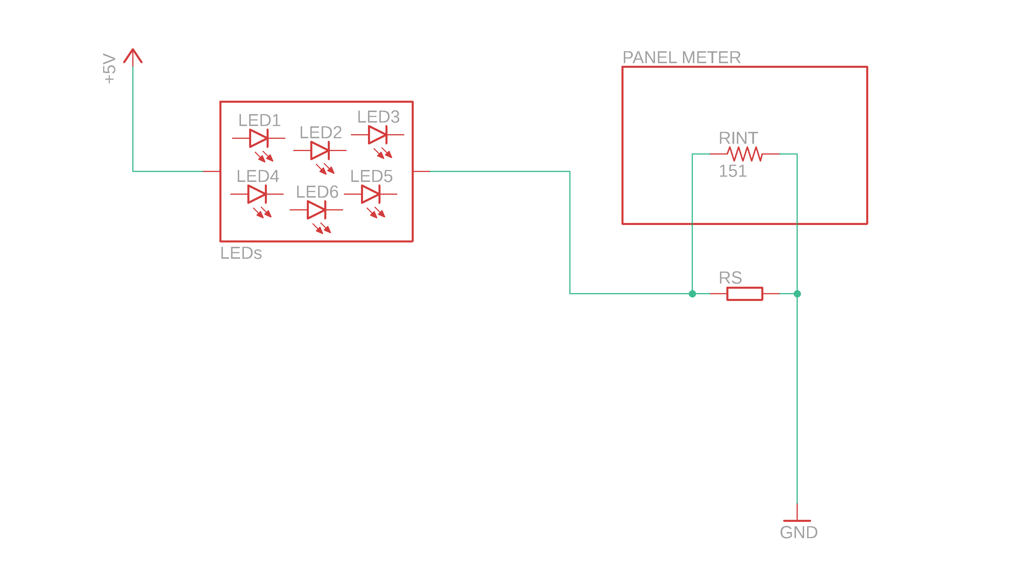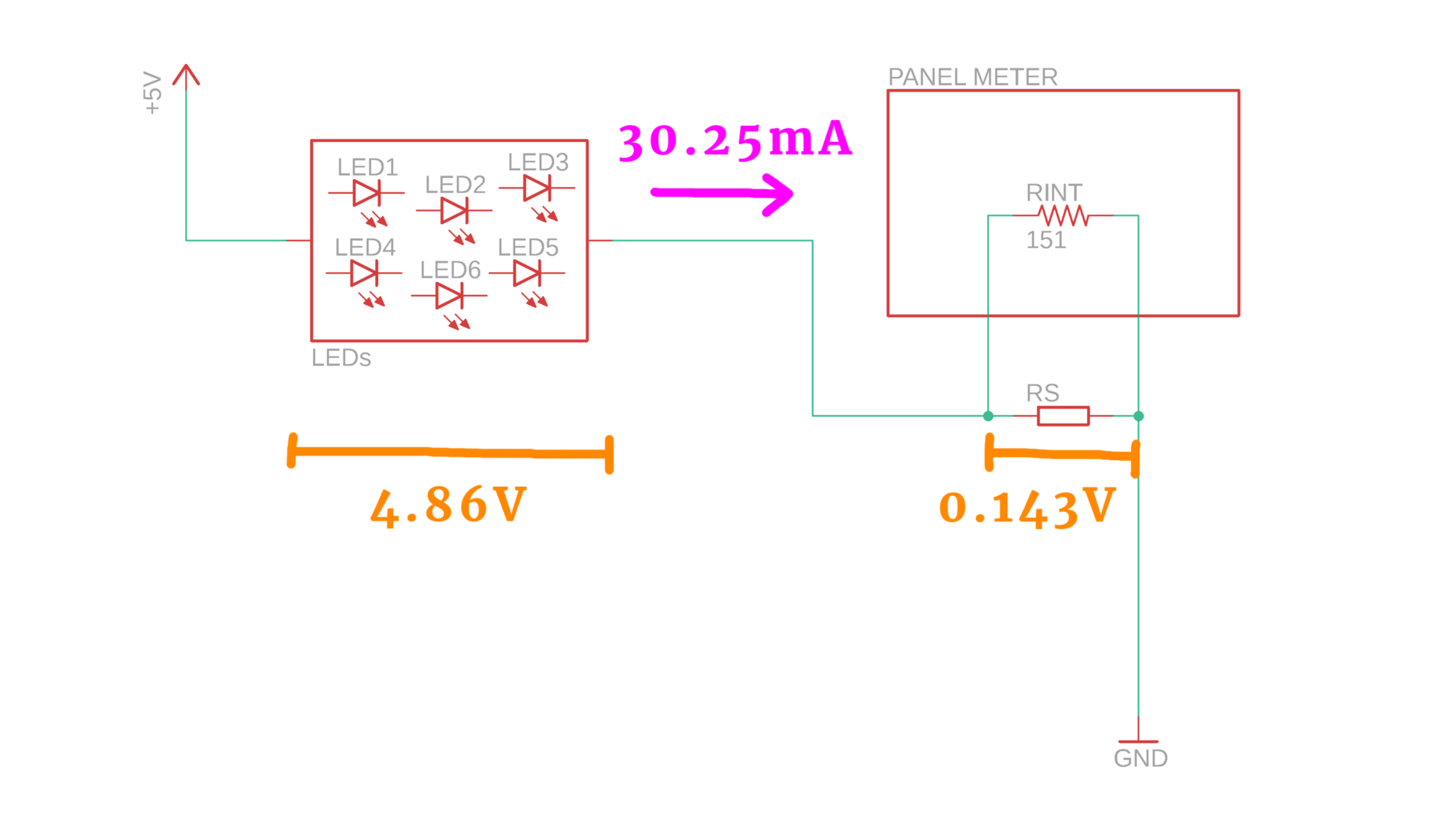 There is +5V at the top left, our LEDs are summarized into a block, there is the panel meter, with its internal resistance of 151Ω, and in parallel to it is the shunt resistor, and at the bottom right there is ground.