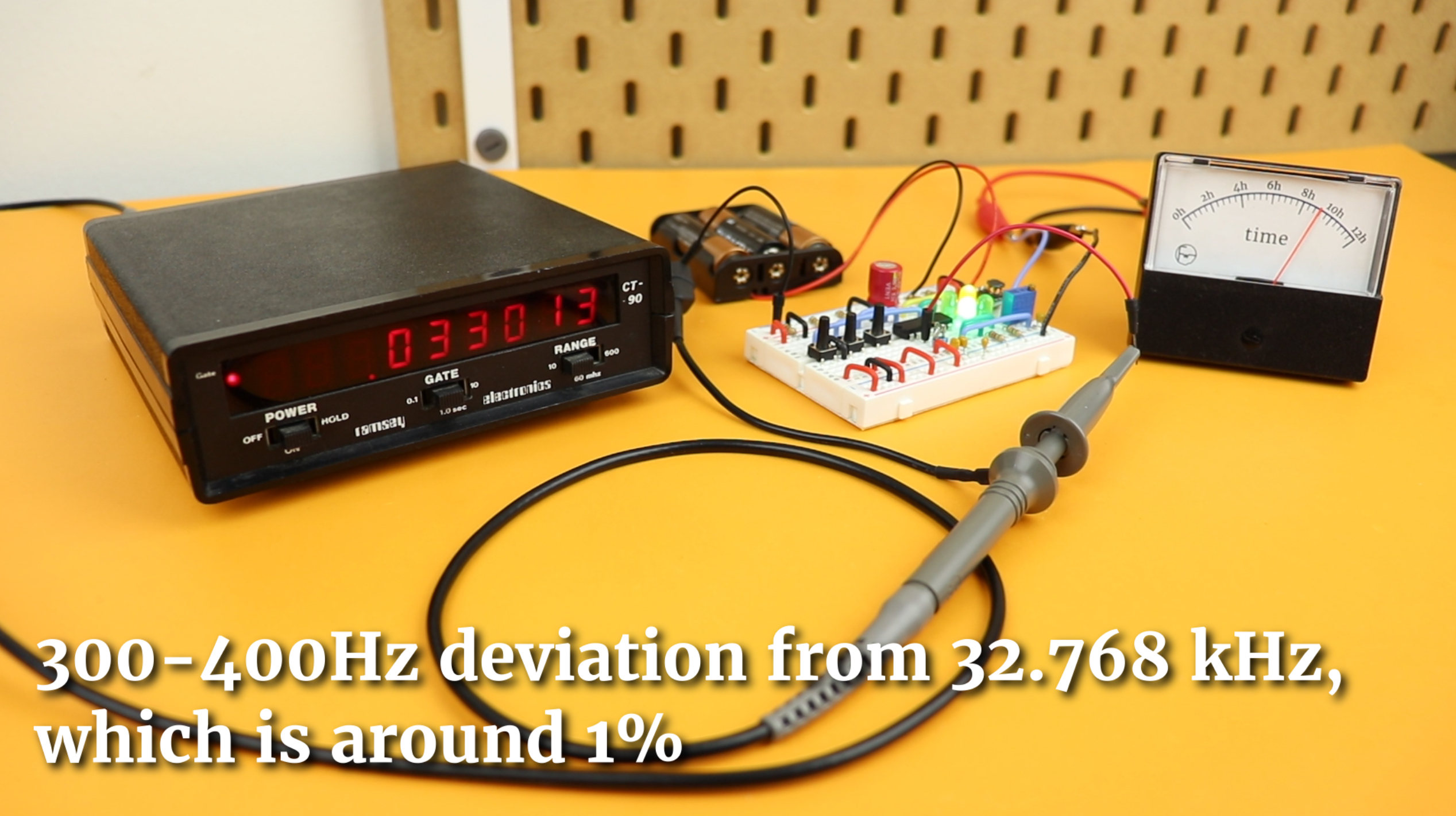 As you can see it does not really oscillate at 32.768 kHz, so the accuracy is not very good. The reason is that most crystals need a specific load capacitance, that's the two 22pF capacitors C3 and C4 in our case here. But the breadboard is made of plastic and metal and that affects the load capacitance. We could solve this by using an adjustable load capacitor, or by tackling this inaccuracy on the software side.