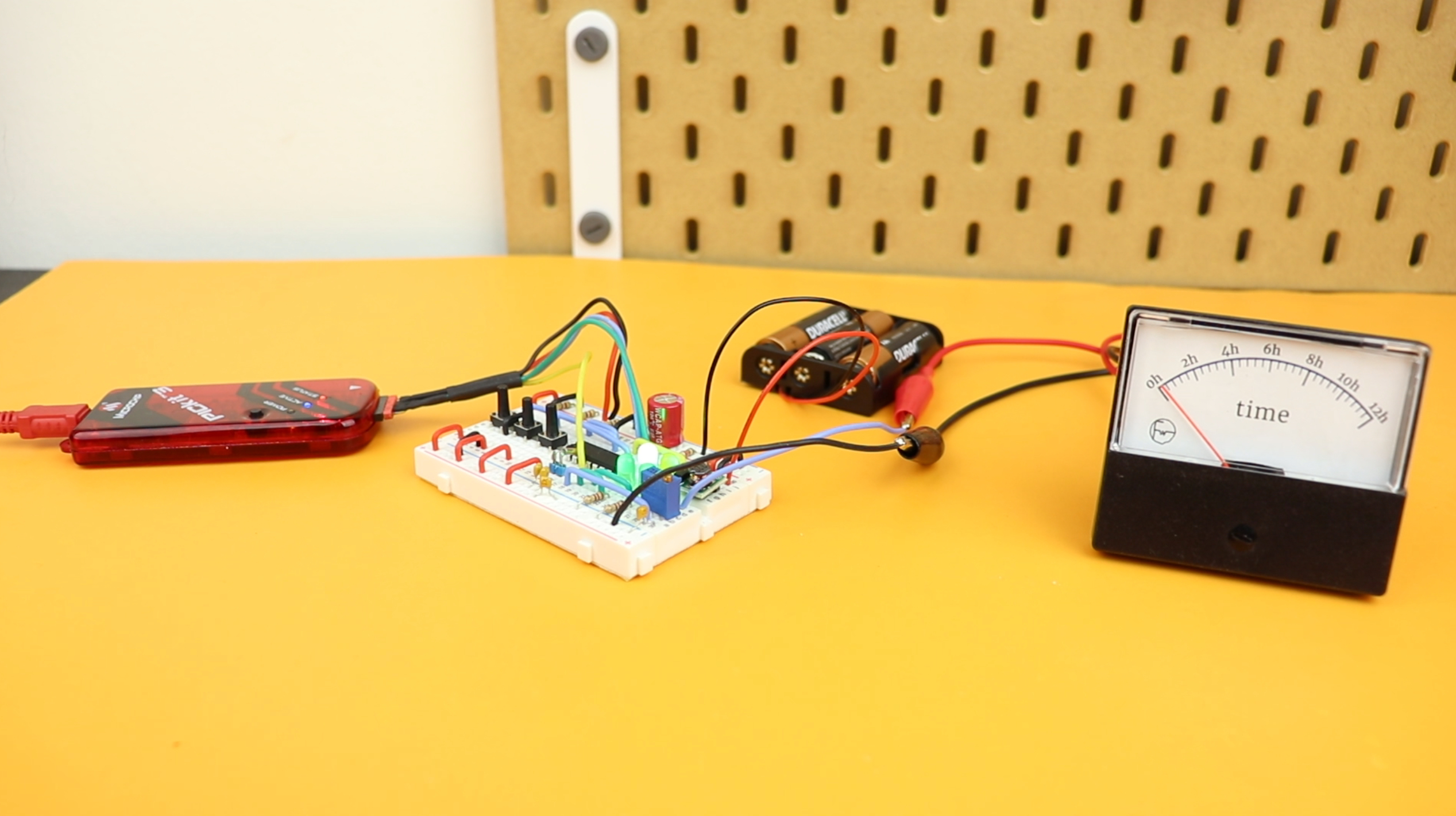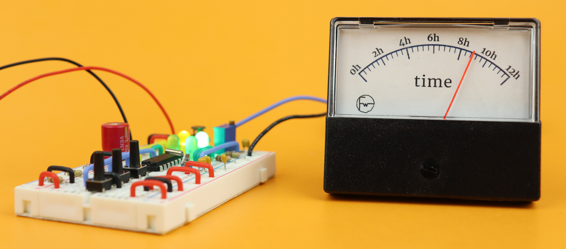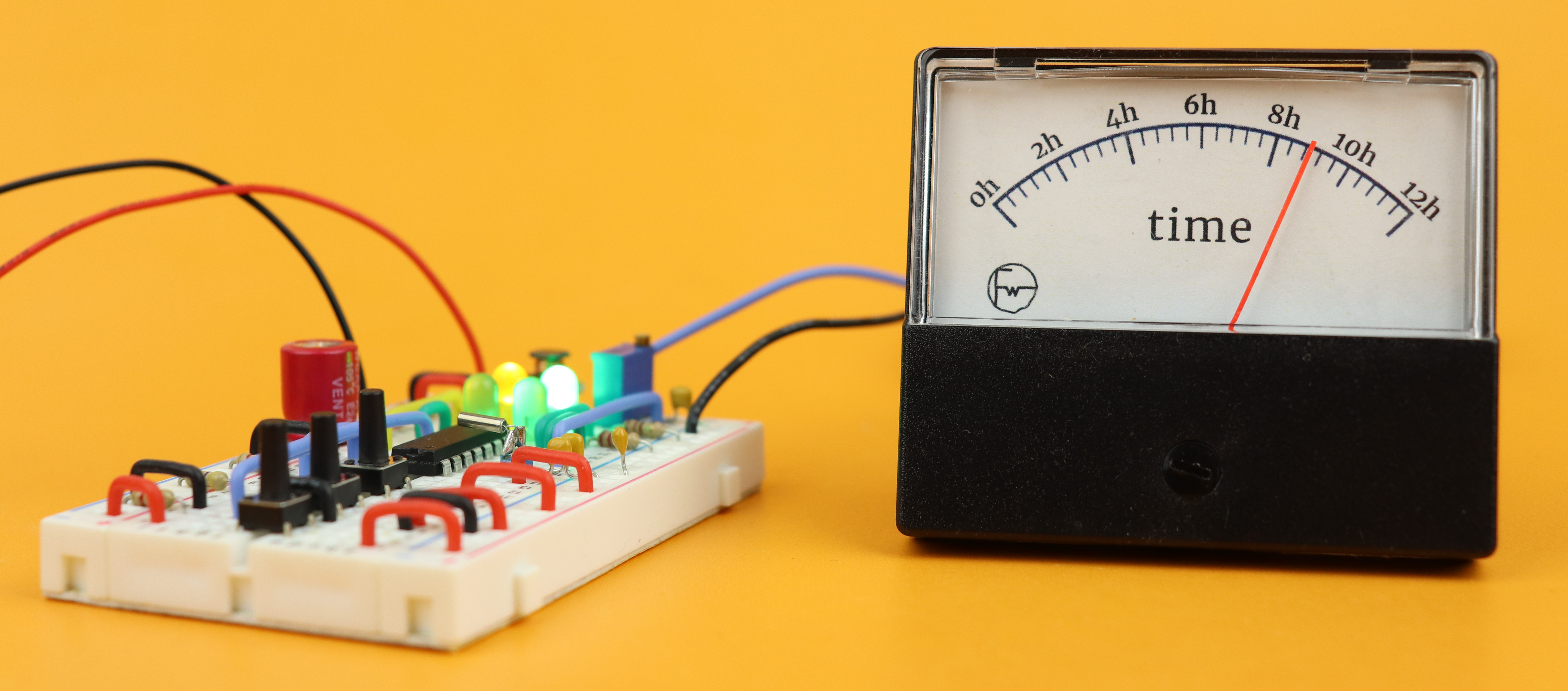 The star of the show is the panel meter that is supposed to tell us the time. And we drive that panel meter with a voltage from our microcontroller using so-called pulse width modulation (the blue line).
