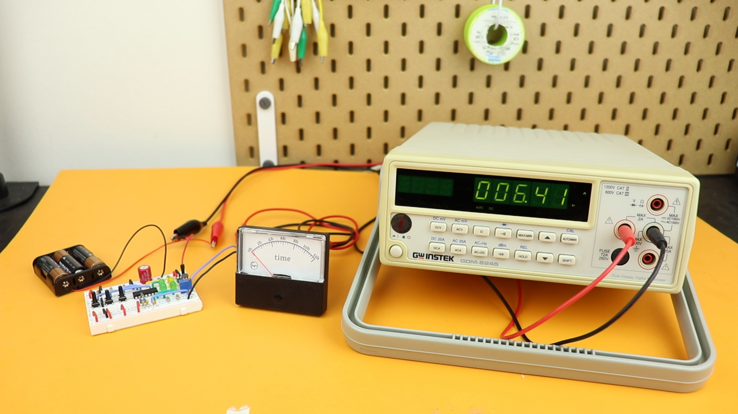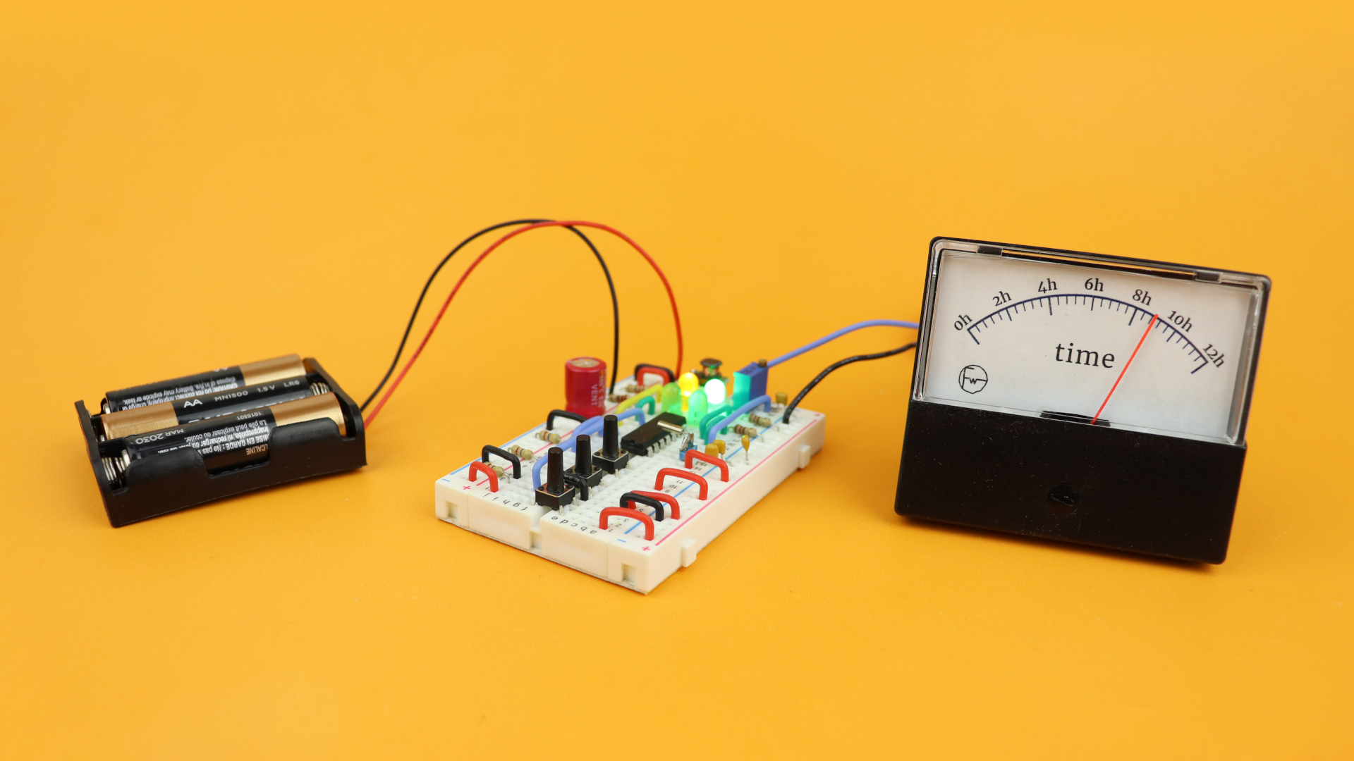 Let's talk about power. The three AA batteries run this circuit, and their voltages add up to 4.5V in total. But when in use the batteries get older, and their voltage becomes lower, so it will be only 4.4 V at some time, then 4.3V, and so on. We need to make sure that we can always generate a stable maximum voltage for the panel meter, because otherwise the position of noon—which is the maximum position on the right—would change on the panel and shift from 12 towards 11.