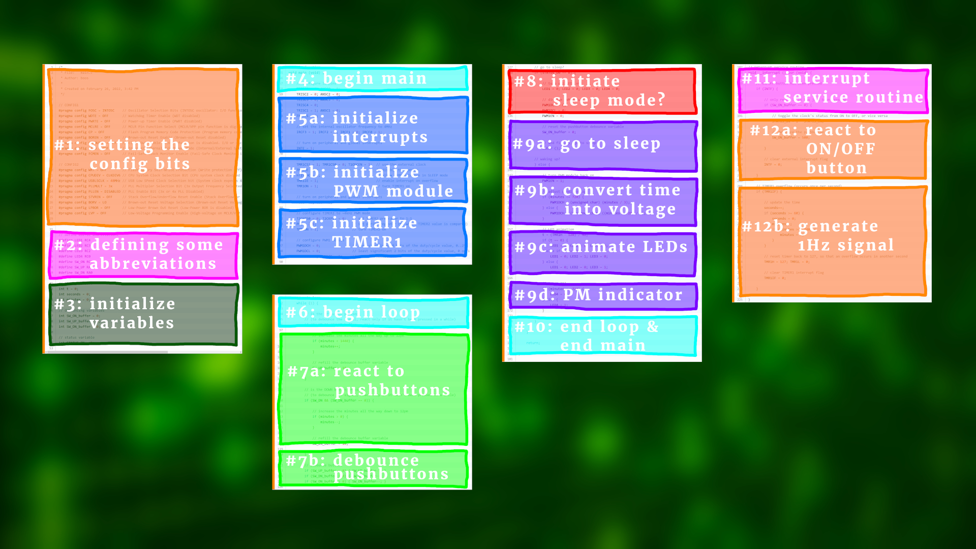 has value 0, then the clock has been turned off. In that case we first turn all LEDs off (line 131), turn the PWM module off (lines 136-136), reset the debounce variable for the ON pushbutton (line 139), and finally go to SLEEP mode (line 142).