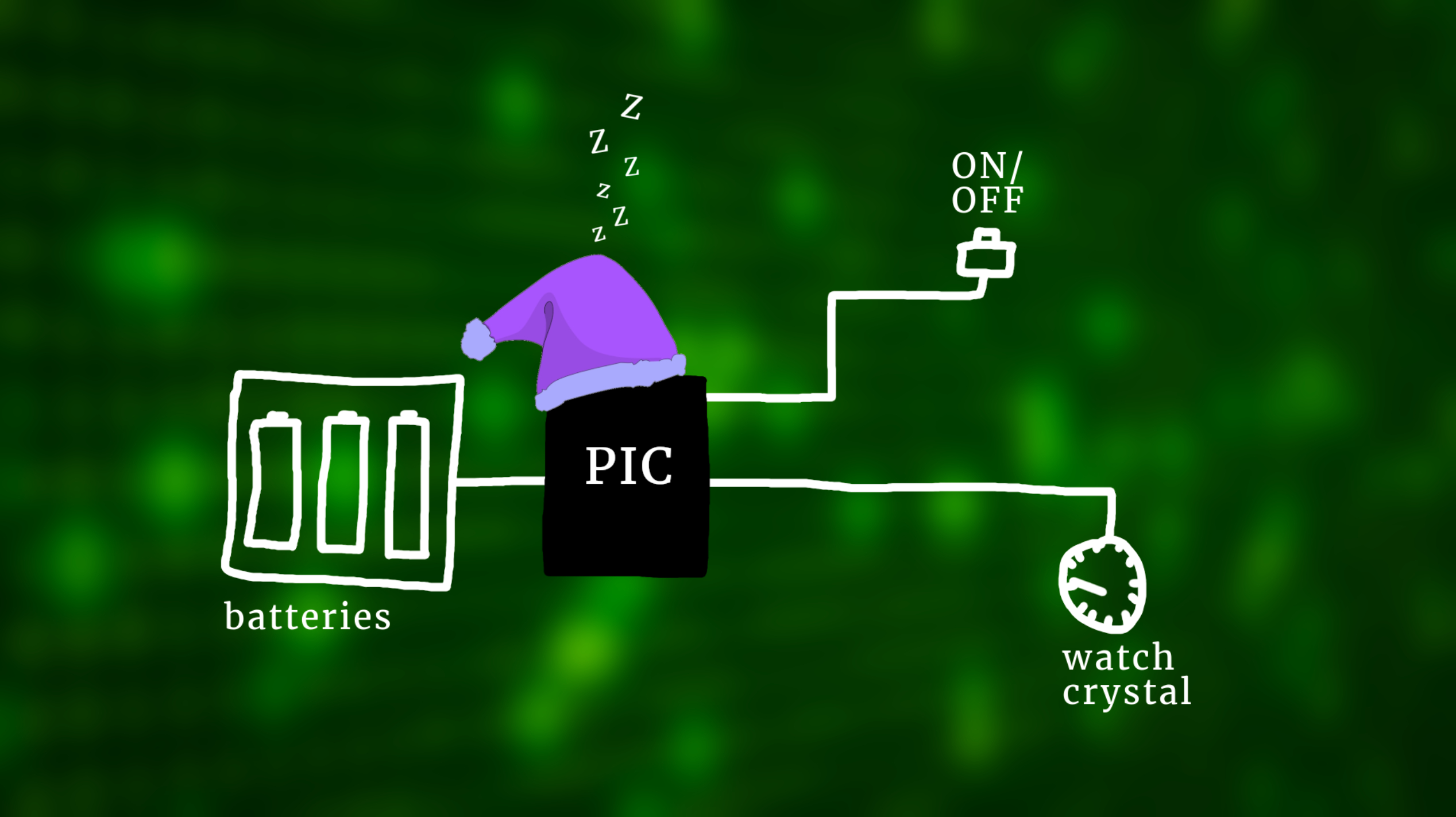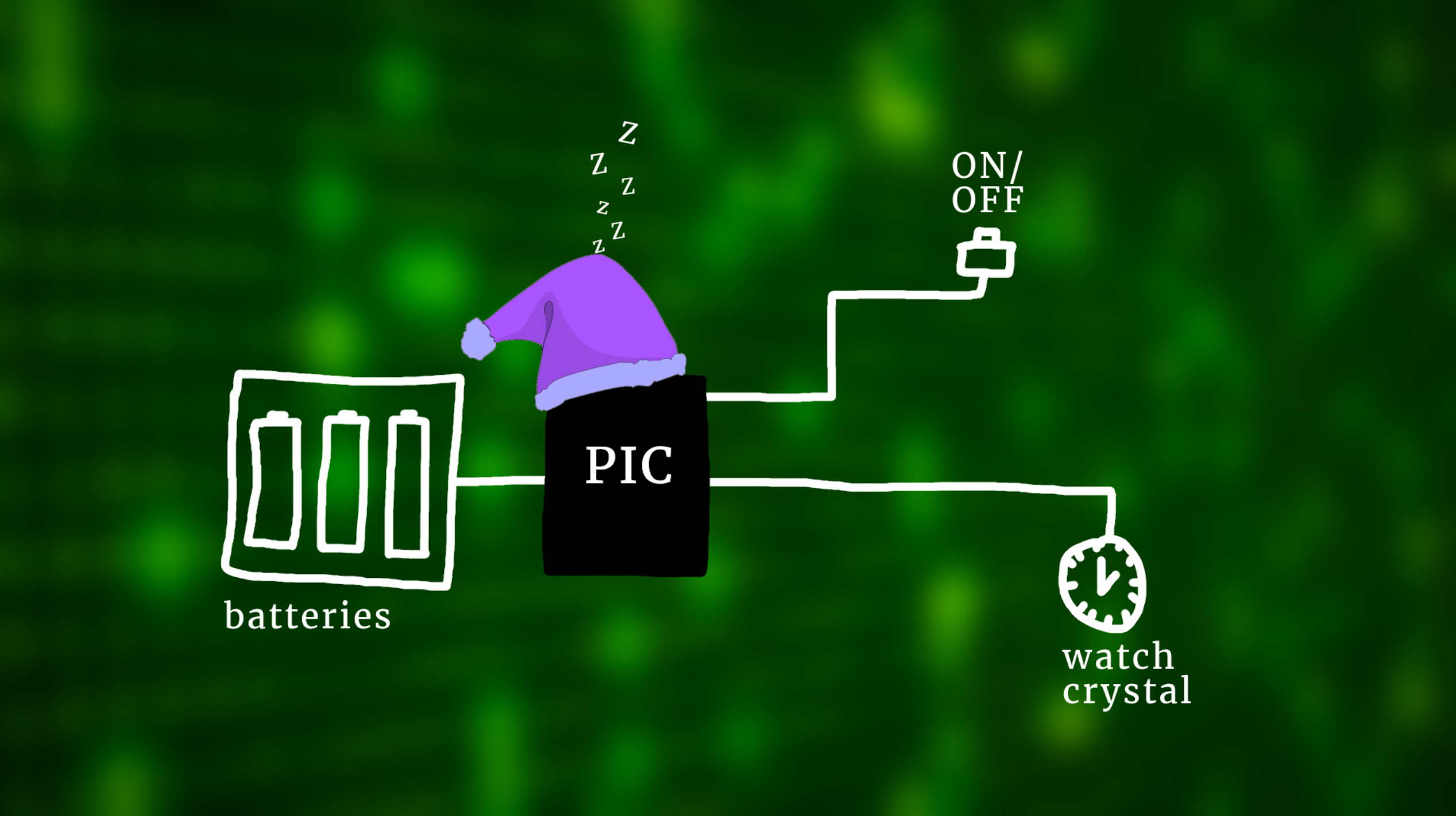 The controller shuts down the internal oscillator and all non-essential hardware, and typically needs less than a few microamps to run. But that's only half of the story. Because when the controller goes to sleep, we also gotta make sure it can wake up again somehow, right?