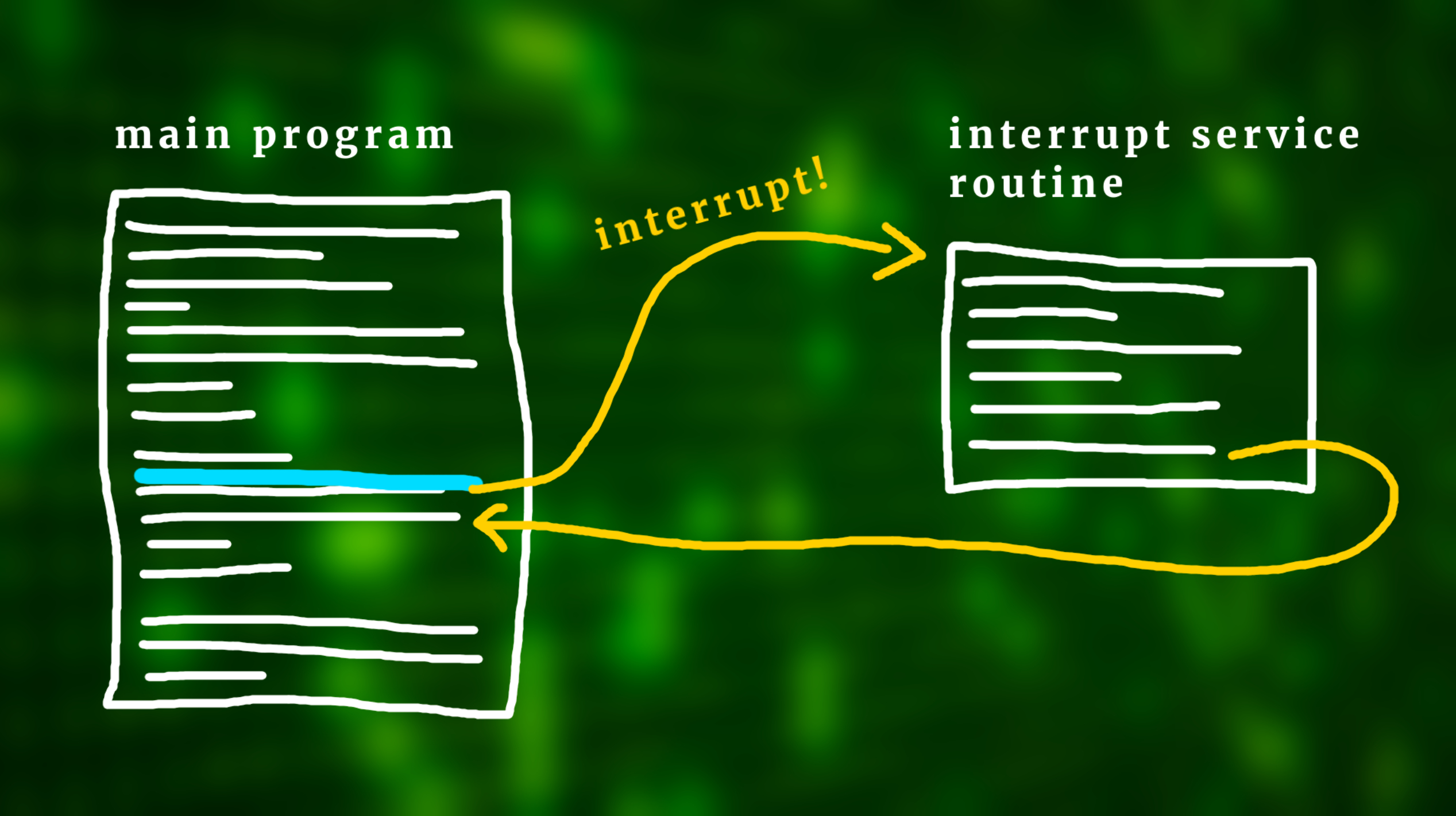 - That's where interrupts come in. Usually, the main part of a microcontroller program is a big loop that runs over and over and over again. But when an interrupt happens, the program jumps to a special part of the code: the so-called interrupt service routine. It basically drops what it is doing and jumps there as fast as it can. Then this code here is run, and after it's completed the main part of the code resumes as before.