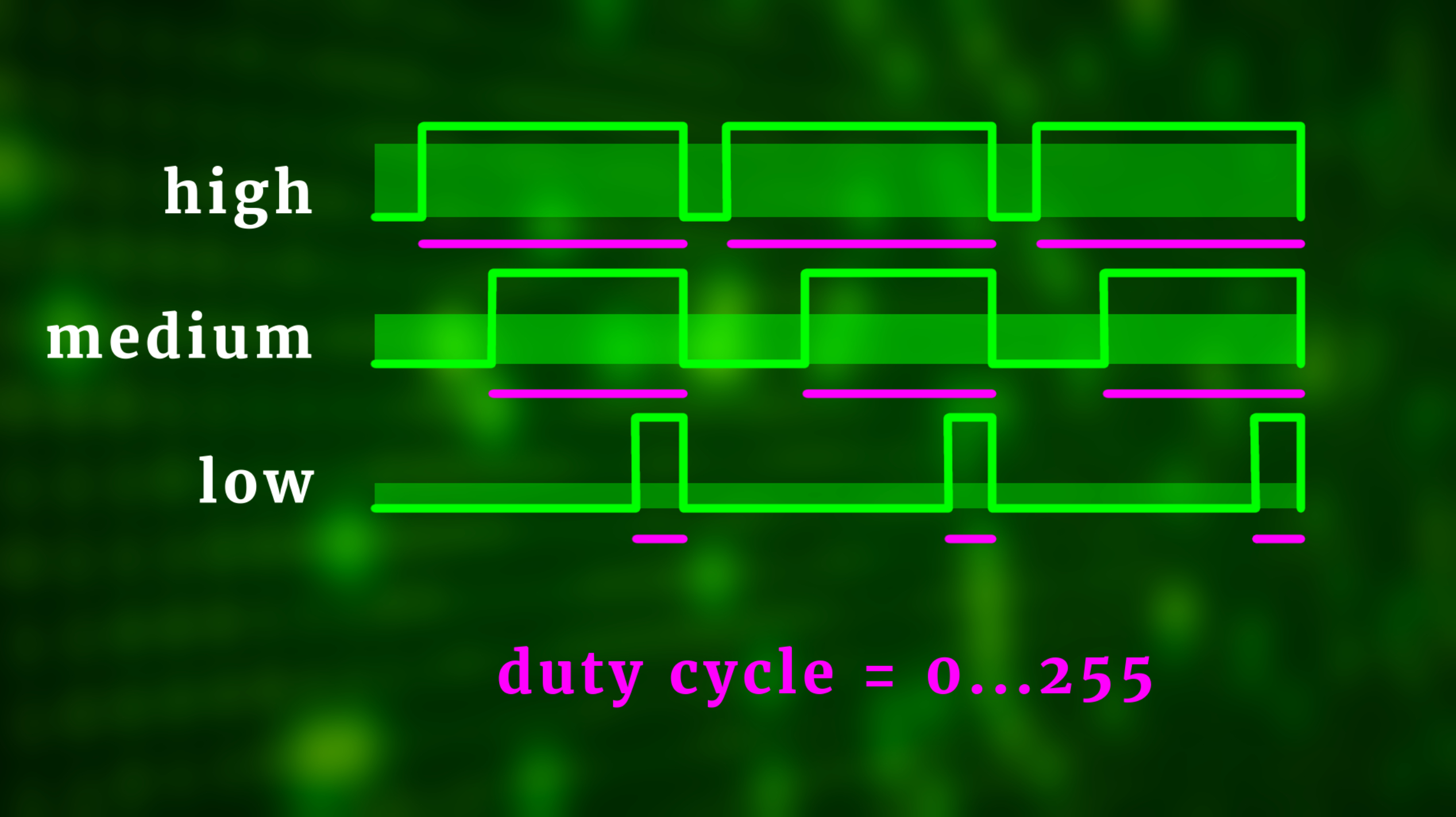 - And last, our program needs to take the time information and convert it into a voltage. For that we use pulse-width modulation or PWM for short. I have a detailed video on this, but in a nutshell, PWM creates the illusion of an analog voltage by quickly turning a digital pin on and off. The longer the pin is on, and that value is called duty cycle, the closer the apparent voltage is to 5V. In our case, the duty cycle is a number between 0 and 255.