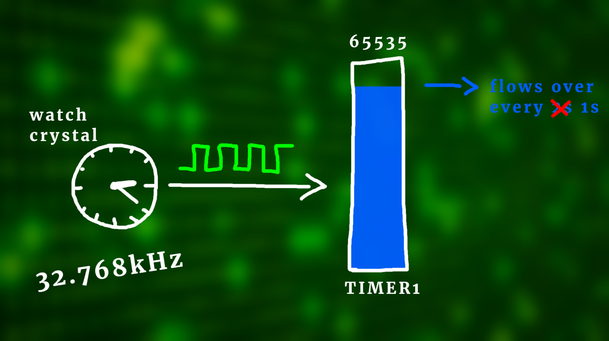 - A timer is just a counter. Timer1 can count up to 65,535, which is 16 bit. In our program we use the watch crystal to feed this timer, and because the watch crystal runs at 32.768 kHz, this timer flows over every 2 seconds. And whenever it flows over, you guessed it, it causes an interrupt! So in the interrupt service routine we can just reset the timer back to zero, or, in our case, back to 32768, because then it flows over every second, and we can use this to keep the time. This is why the watch crystal has such a weird frequency: it is literally made for this purpose. And like we said before, timer1 keeps running in sleep mode, because it uses the external crystal, so it will keep the time accurate even if the controller is in SLEEP mode.