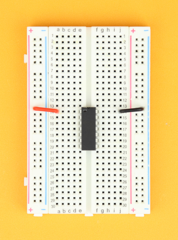 Insert the PIC16F1455 in row 14, and connect pin 1 (top left) to the positive power rail, and pin 14 (top right) to the negative power rail.