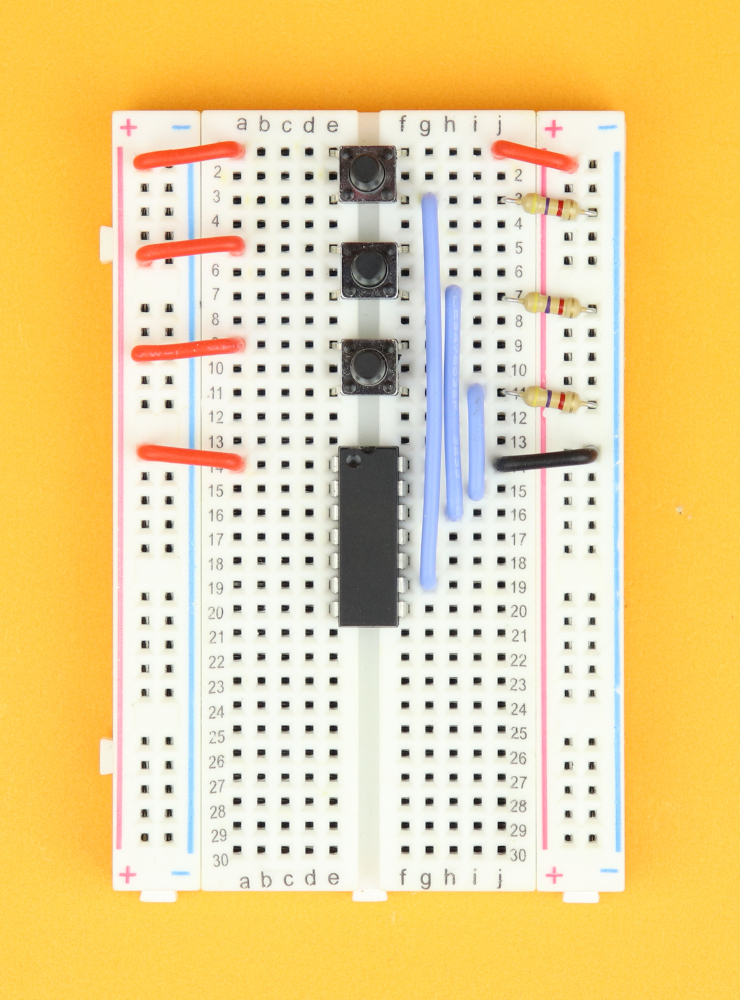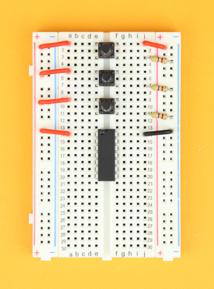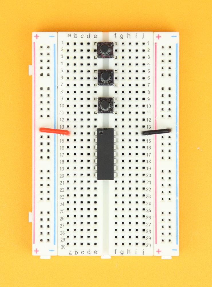 Connect the top left terminal of each pushbutton to the positive power rail. Connect the top right terminal of the upper pushbutton to the positive power rail on the right side of the breadboard.