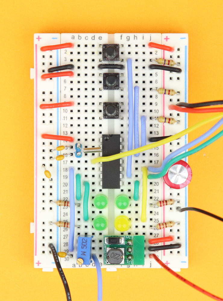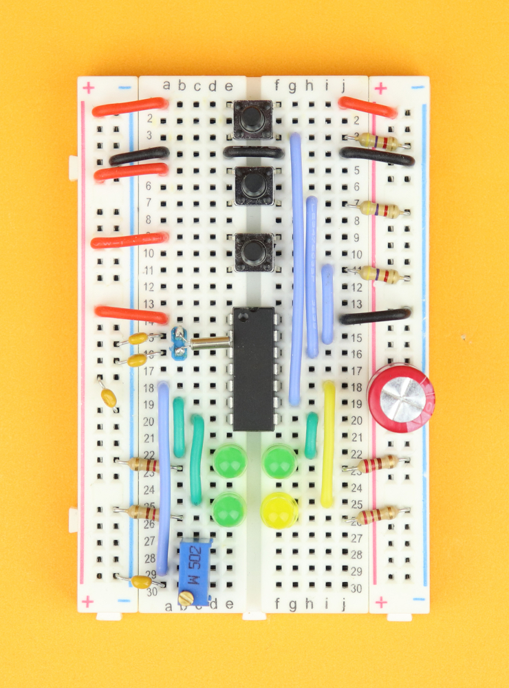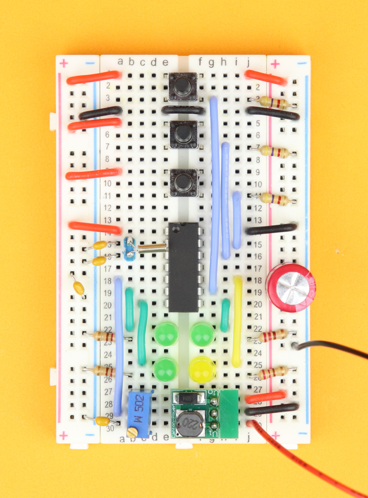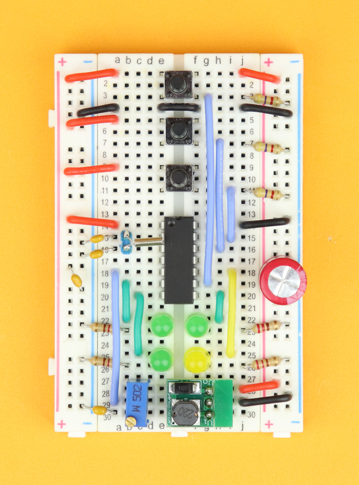 - All of this runs off of batteries, and besides them you also need some LEDs, some capacitors, resistors, pushbuttons, and of course a breadboard.