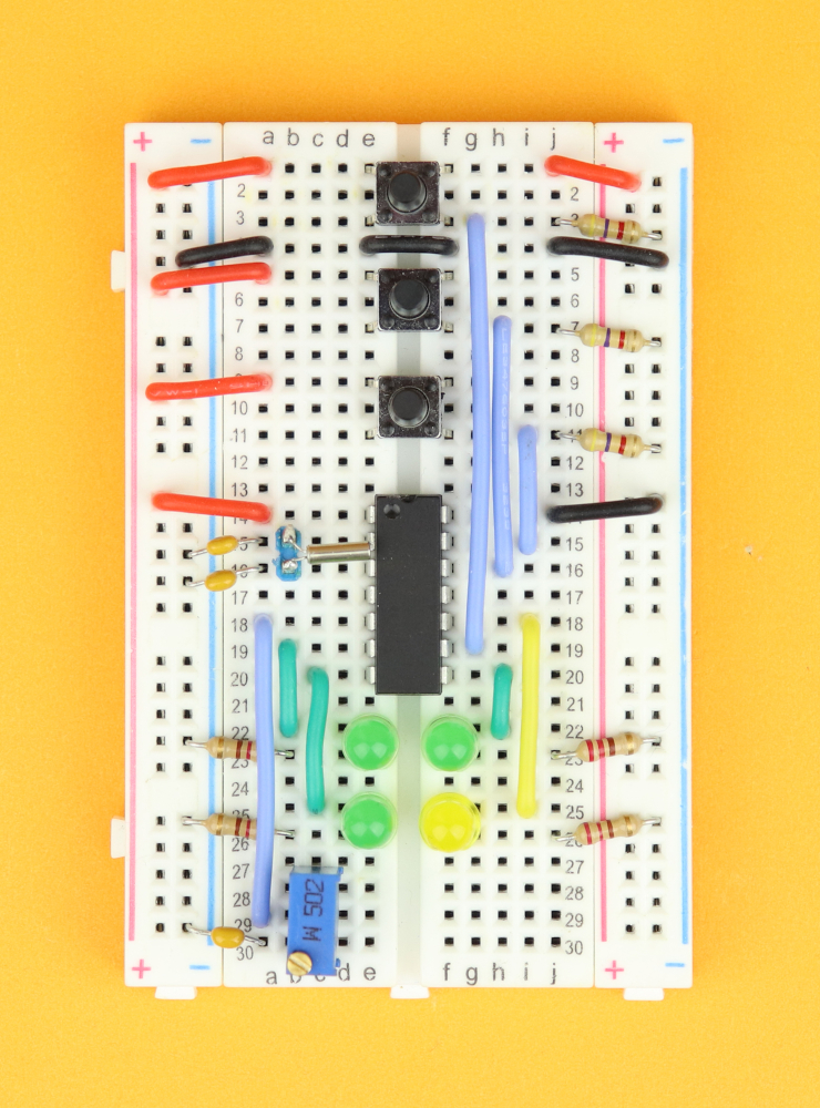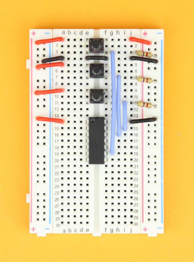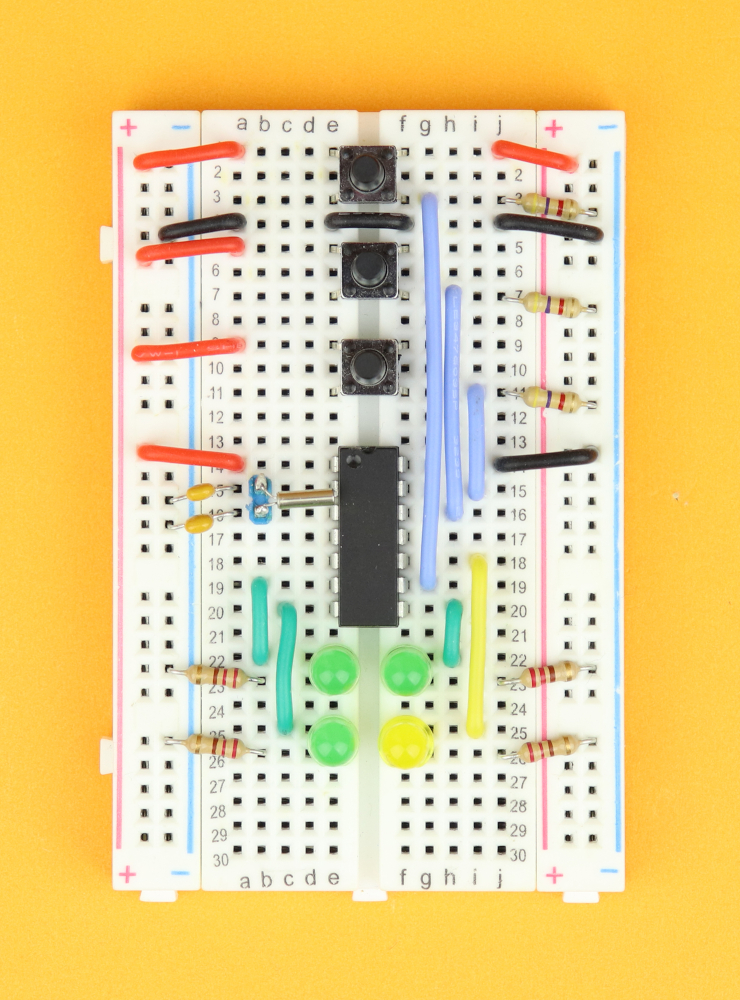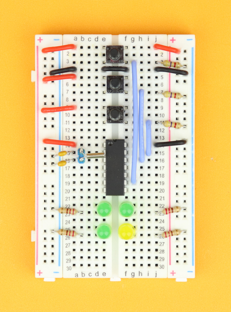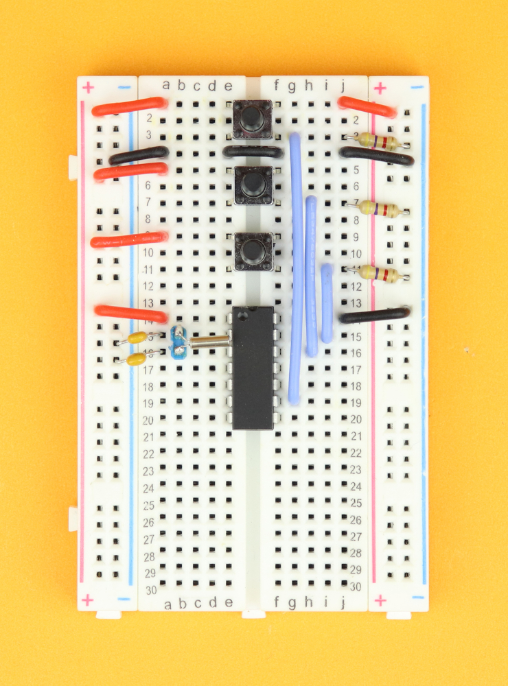 - All of this runs off of batteries, and besides them you also need some LEDs, some capacitors, resistors, pushbuttons, and of course a breadboard.