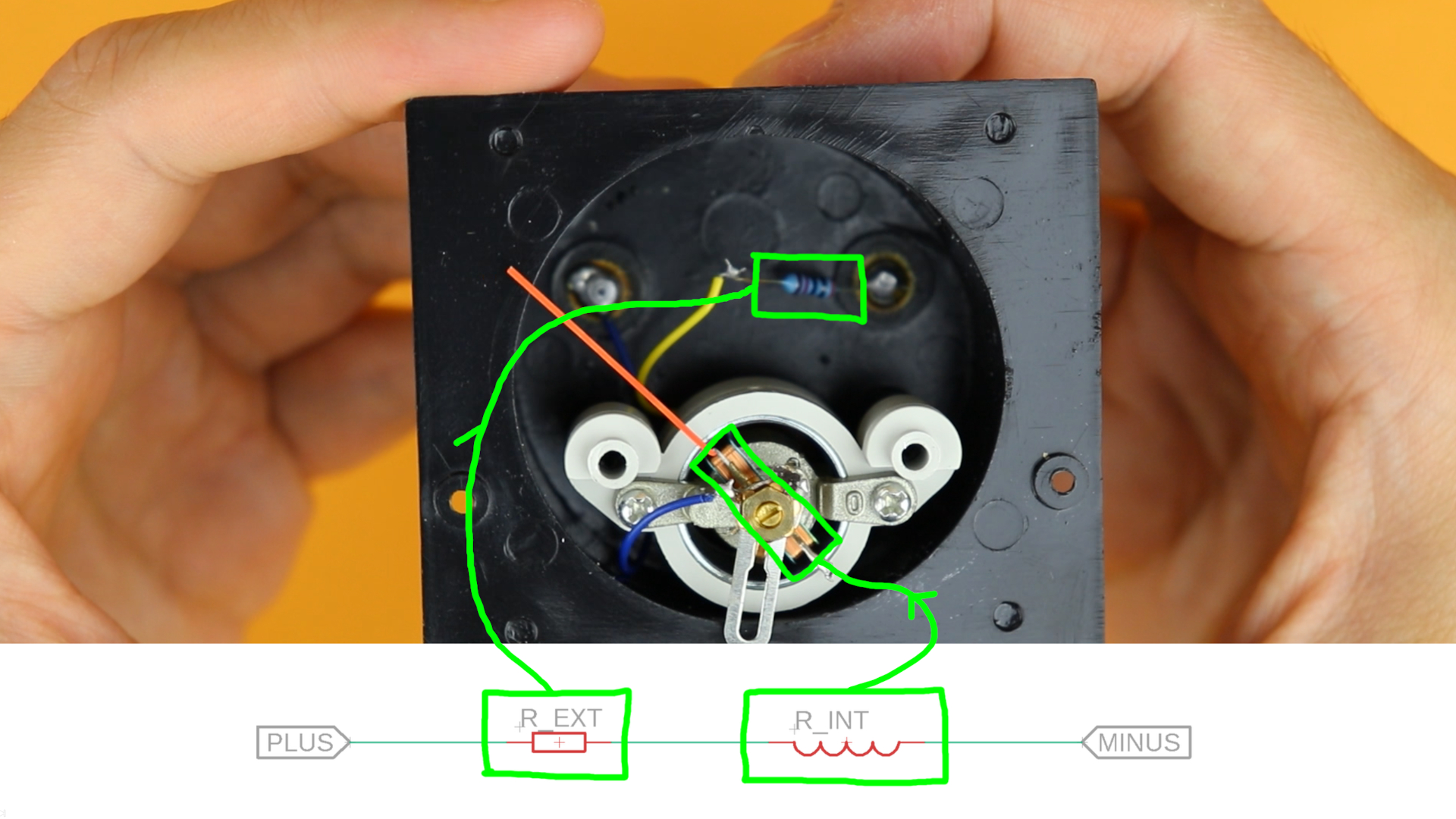 I have a detailed article on panel meters that you can check out for additional details. In a nutshell, there are two important values: the resistance of the coil itself, and I call that Rint, and the current at which the panel meter maxes out, and I call that the saturation current Isat. For most voltmeters there is an additional external resistor Rext that calibrates the panel meter to a required voltage. Here is a picture of the voltmeter I am using for this project: