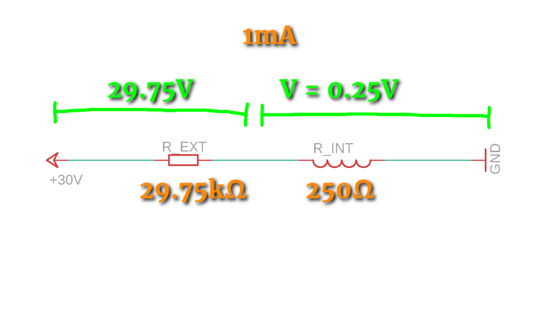 It's a 30V voltmeter, so there is some extra resistor. Measuring these values I find that Rint = 250Ω, Rext = 29.75kΩ, and Isat = 1mA. Here is how that all works out, using Ohm's law: