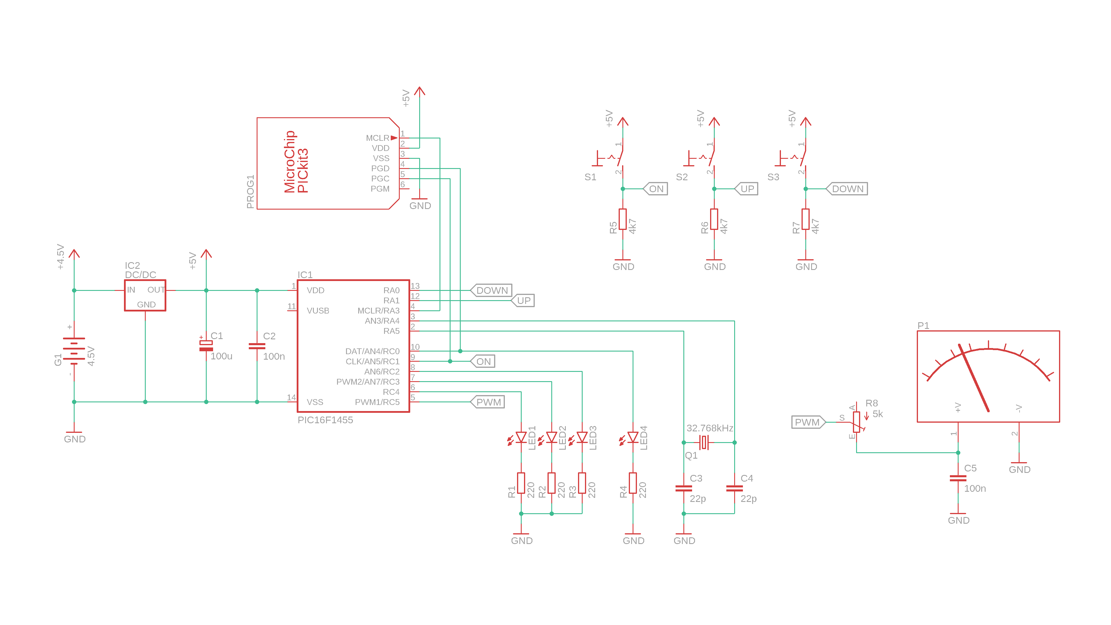 The PIC16F1455 microcontroller is in charge of everything. It controls the four LEDs, reads the status of the three pushbuttons, and it uses the 32.768kHz crystal here to create a 1-second timebase so it can work as a clock. It also outputs a pulse-width modulation signal here that we feed to the panel meter.