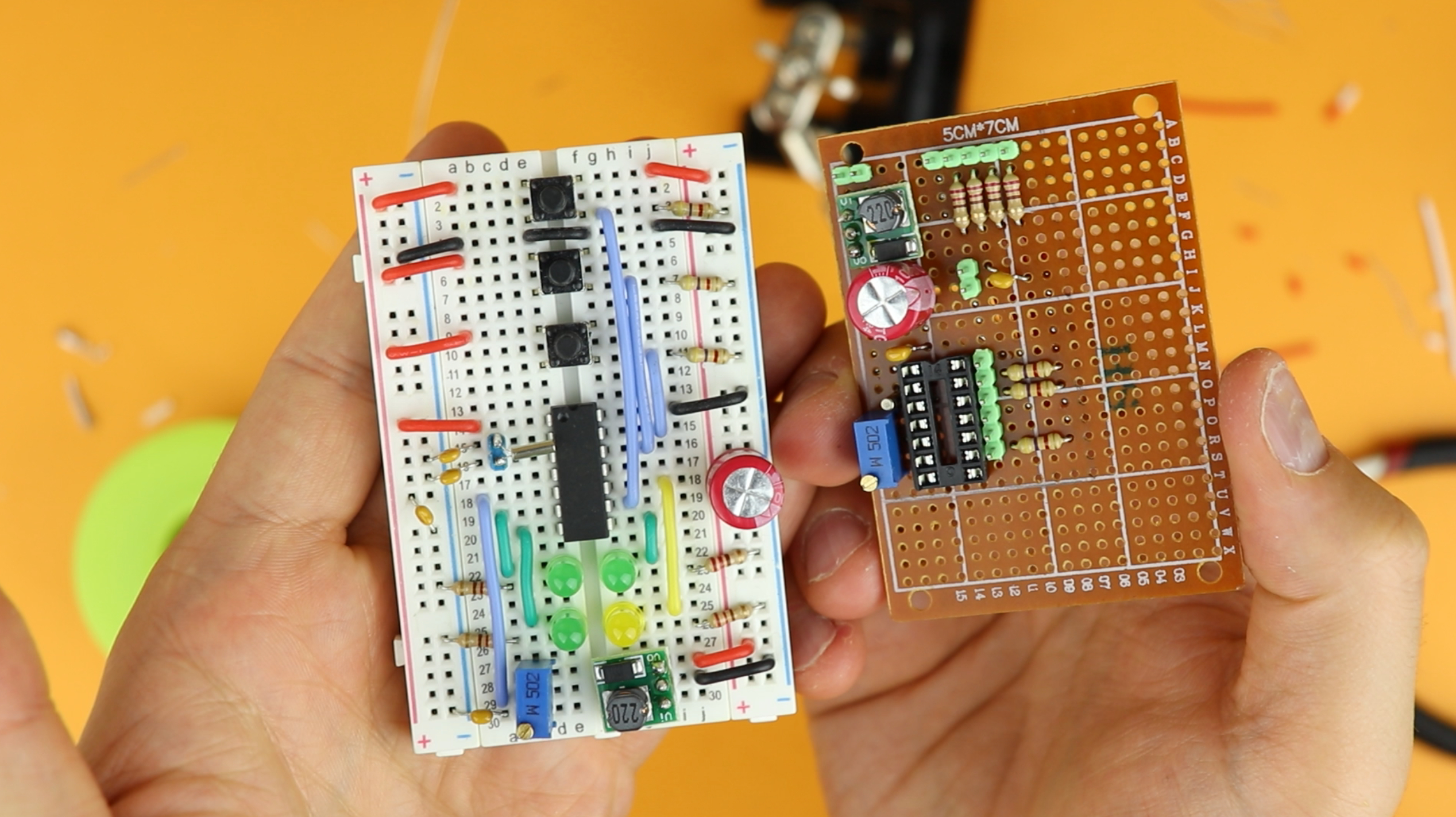 And here you can see the breadboard circuit and the PCB-circuit side by side: