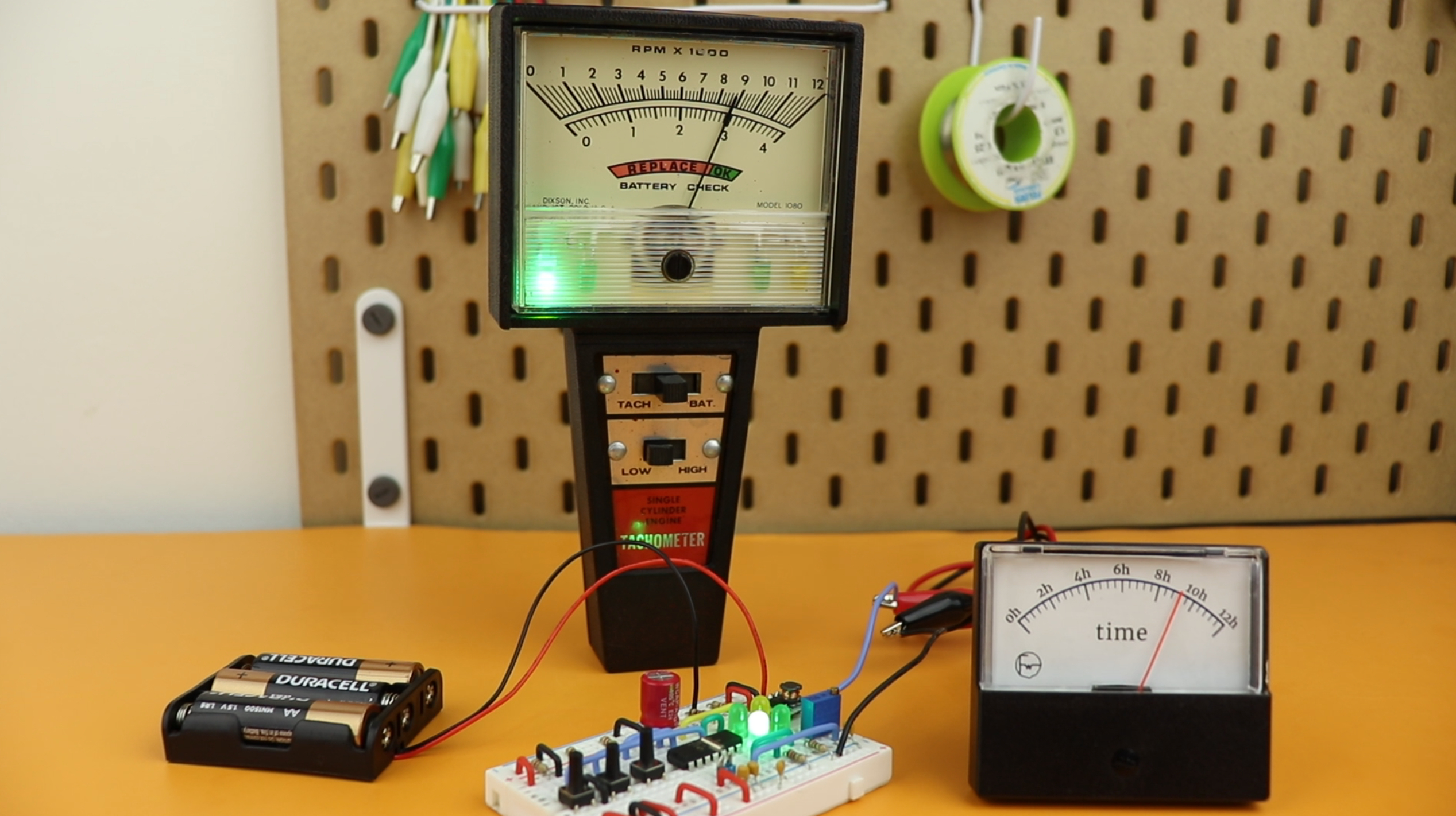 The panel meter shows the time, here from 0 to 12, and a yellow LED on the breadboard tells us whether it is PM or not. The three pushbuttons on the breadboard are used like this: