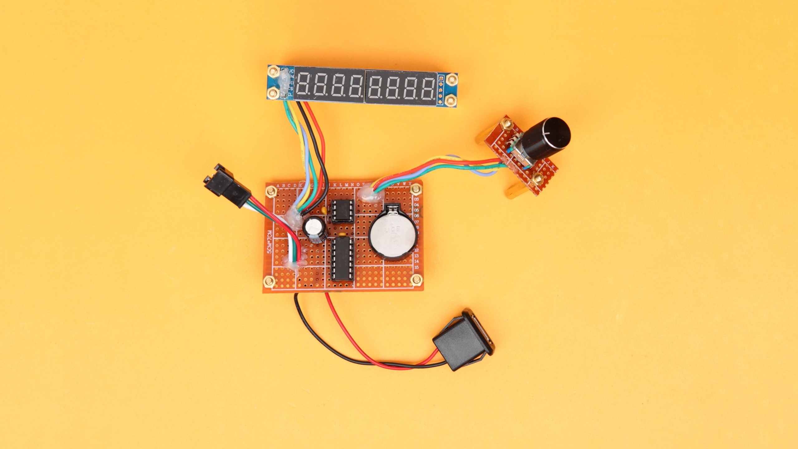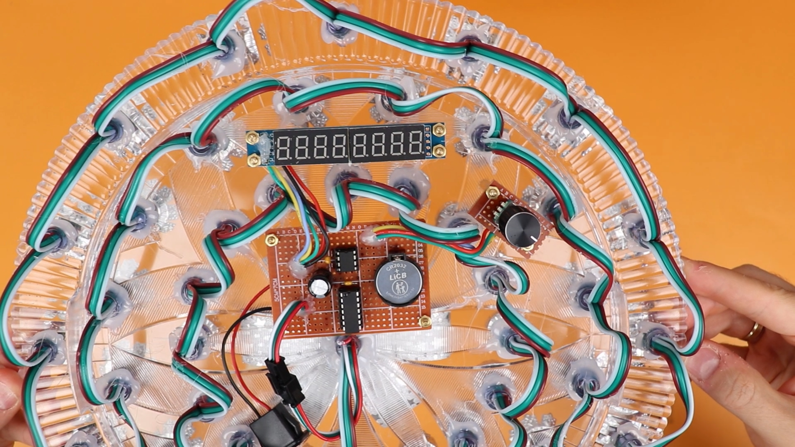 The USB adapter is at the bottom right, and the three-terminal cable is where we connect the WS2811 LED strip. The rotary encoder and the 7-segment displays are on separate boards, and the main board holds the PIC, the real-time clock, and the coin cell battery. I glued the wires in place with hot glue to act as a strain relief because I did not want any of the wires to break.