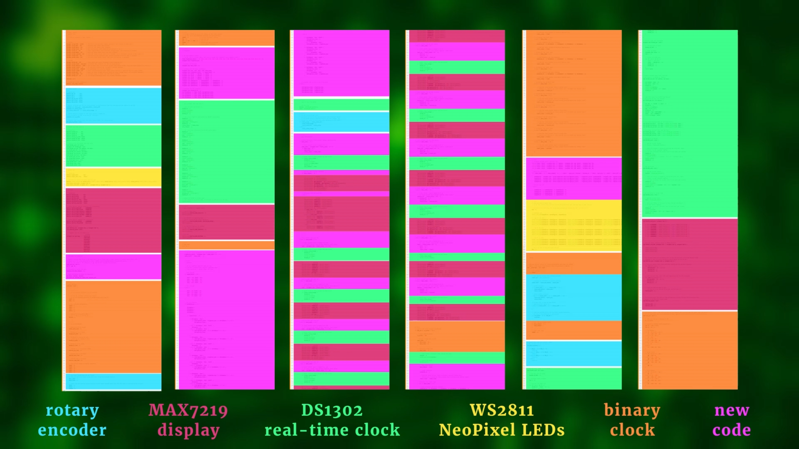 But those ON and OFF times are not the same across the groups, and that is what creates these interesting patterns. In the code there are two modes, a fast mode and a slow mode, so: two sets of time variables. You can find them here: