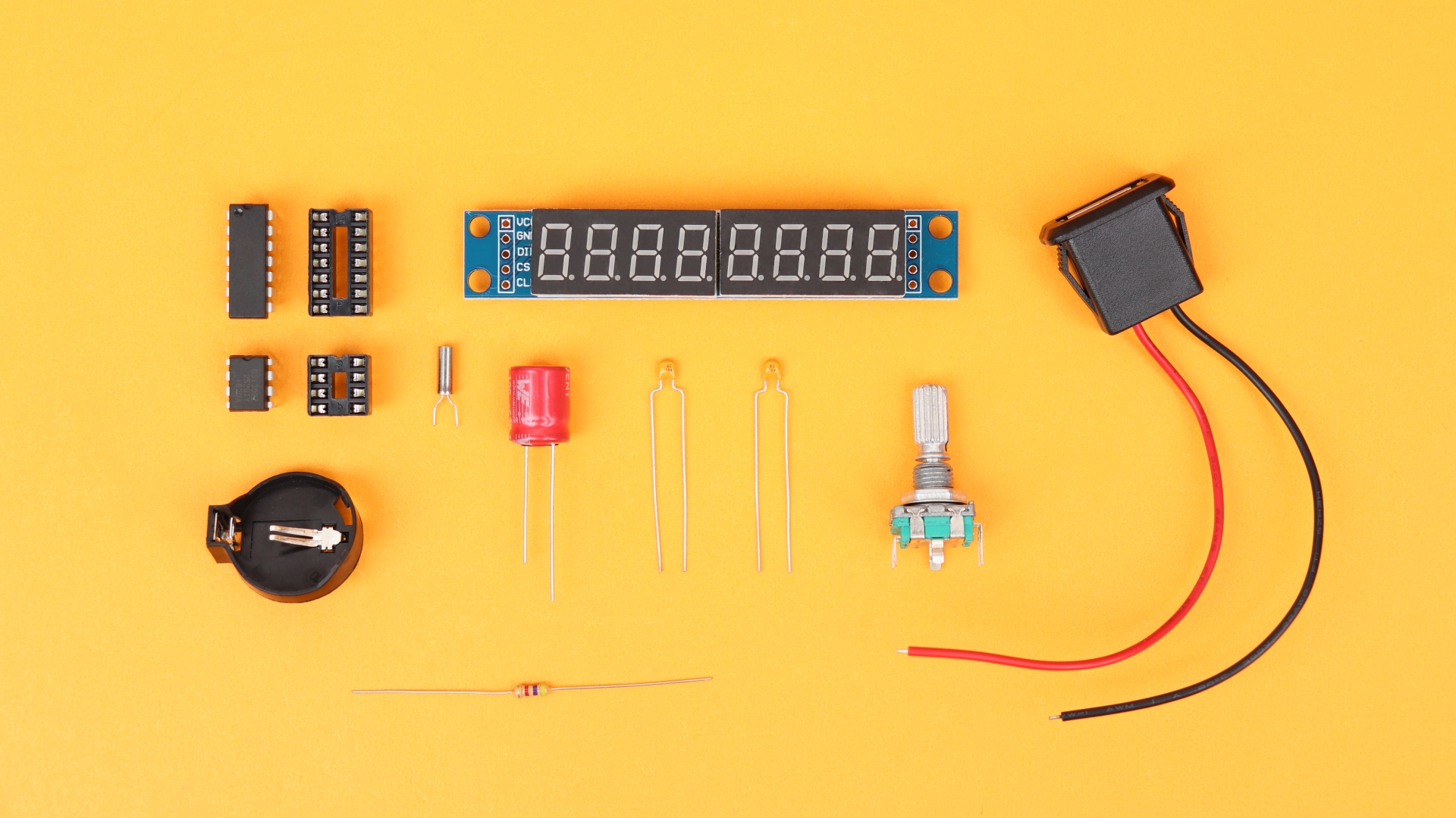 - the DS1302 real-time clock IC, together with an 8-pin socket, a coin cell battery holder and a 32.768 kHz watch crystal (which you can all find on a single board for very cheap)