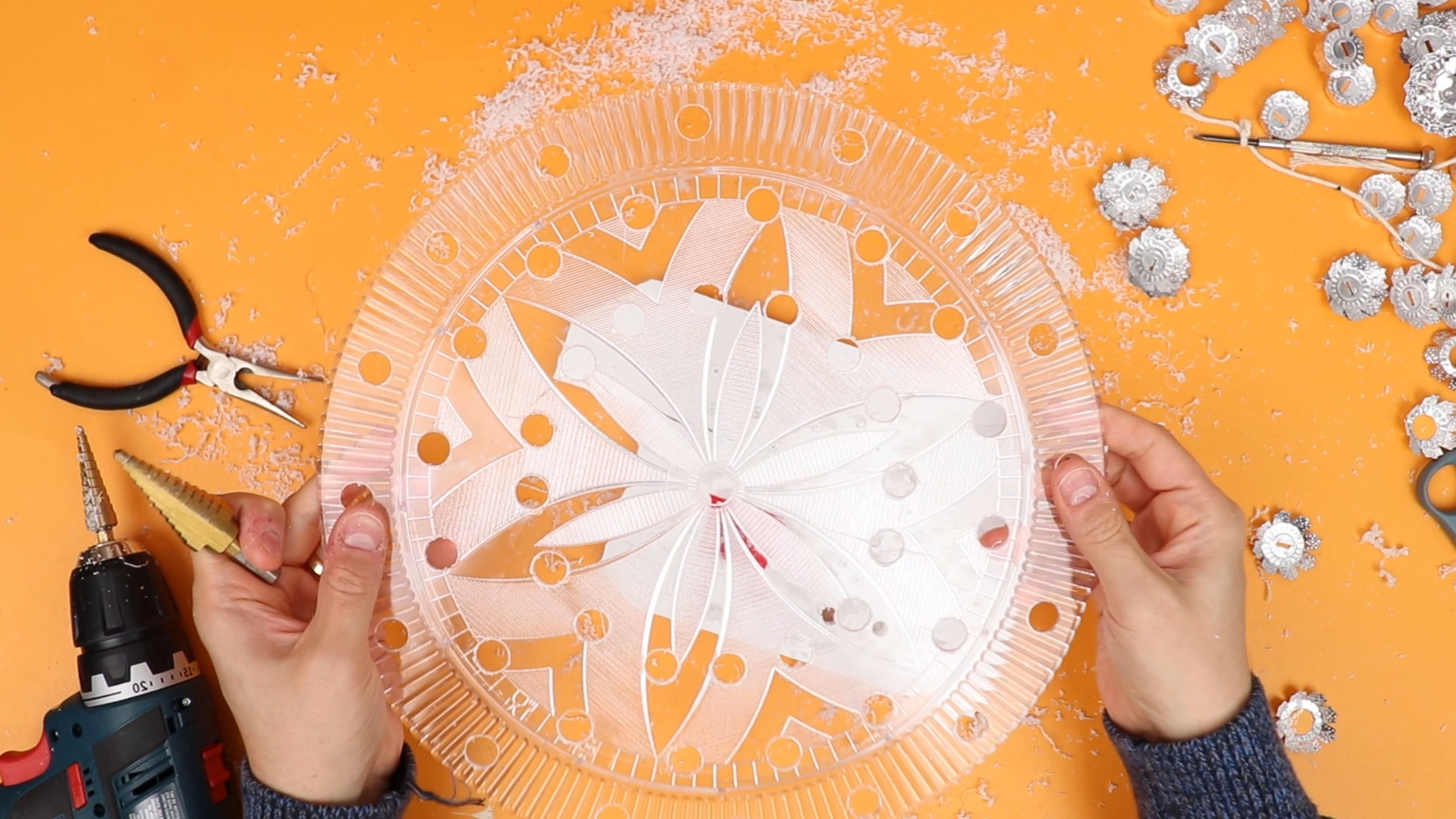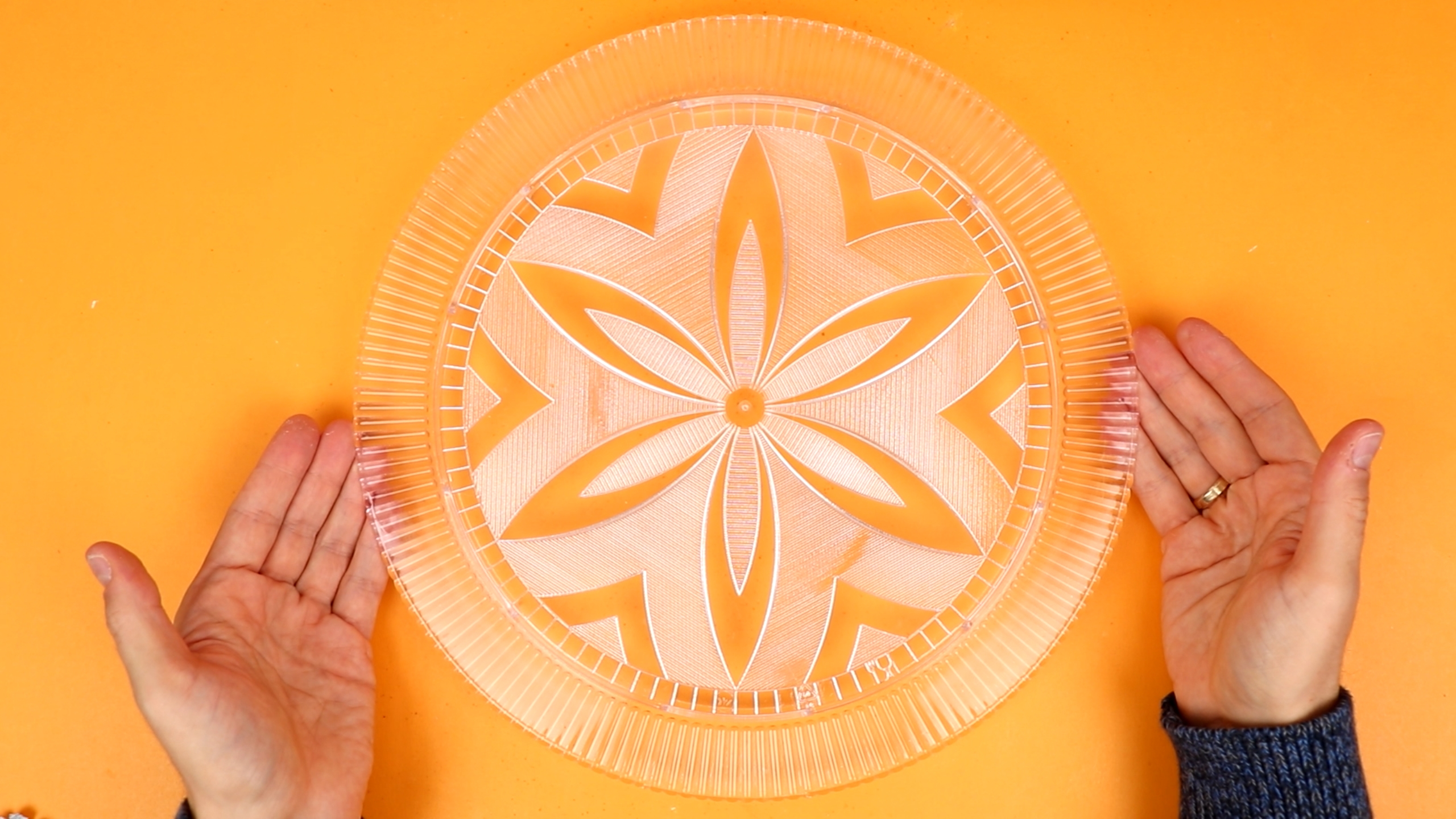 But at that point I got very excited, because it looked like the project was going to be a success. Now, the original Christmas stars have all lights mounted on a specially made frame, but I always found that a bit flimsy, and I did not know how to fabricate one. But then I discovered that an ordinary acrylic cake plate is the perfect choice, and they even come with nice patterns built in: