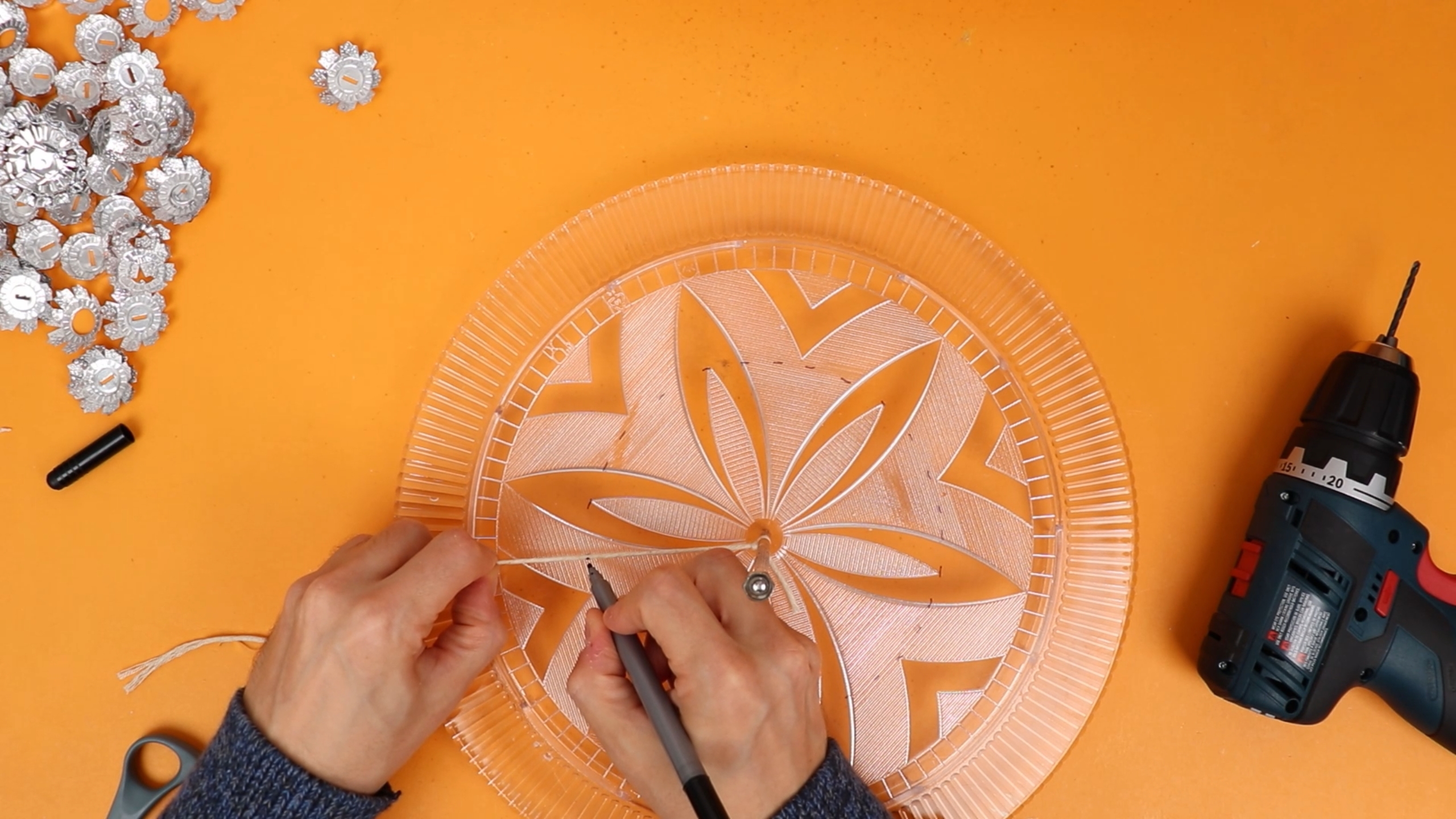 Next, I drilled a 3mm hole in the center, and then stole our cat's toy string to mark three concentric circles: