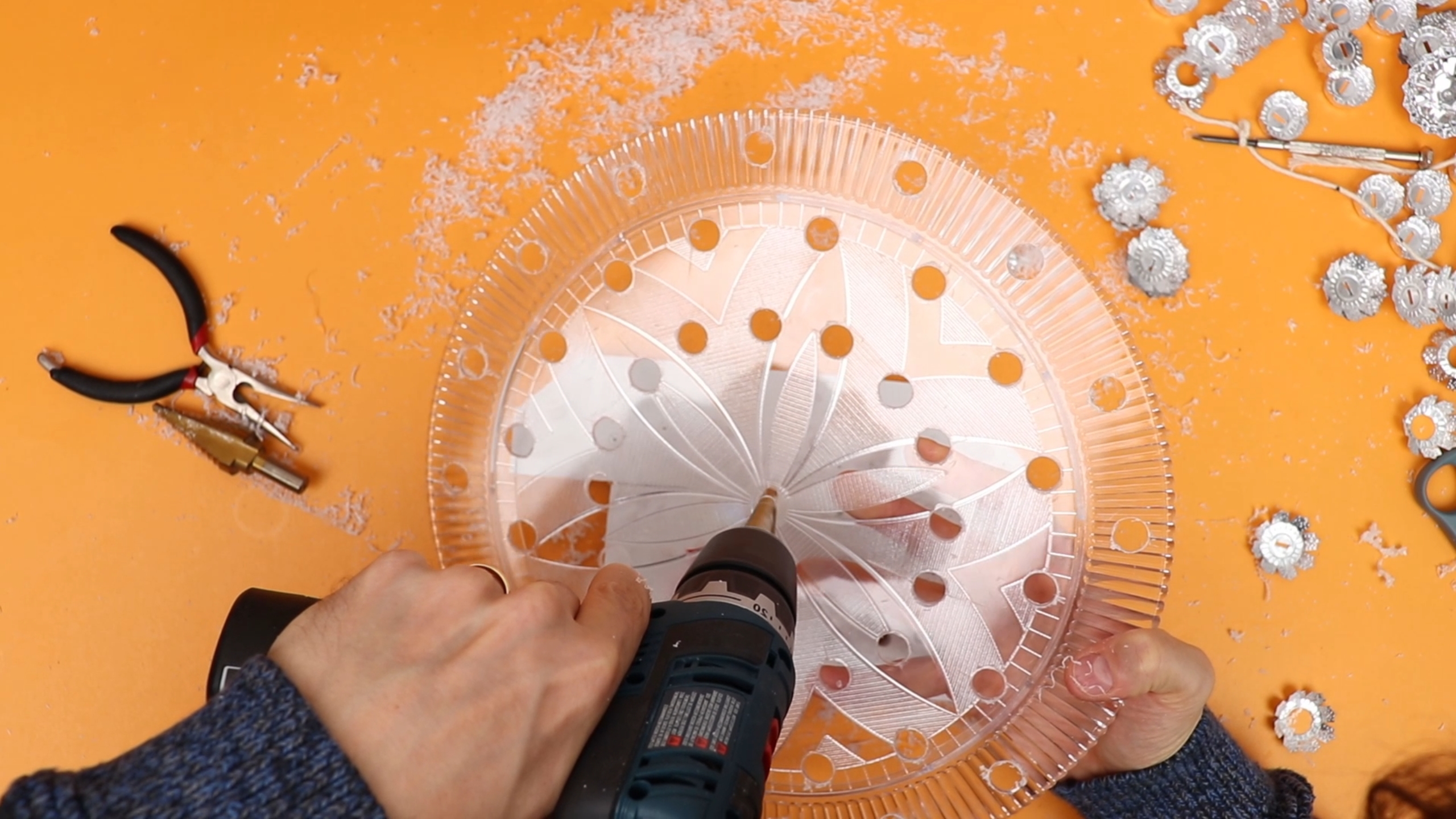This is acrylic so you have to be careful when drilling it so that it does not crack, but I found that a step drill works great if you take your time.