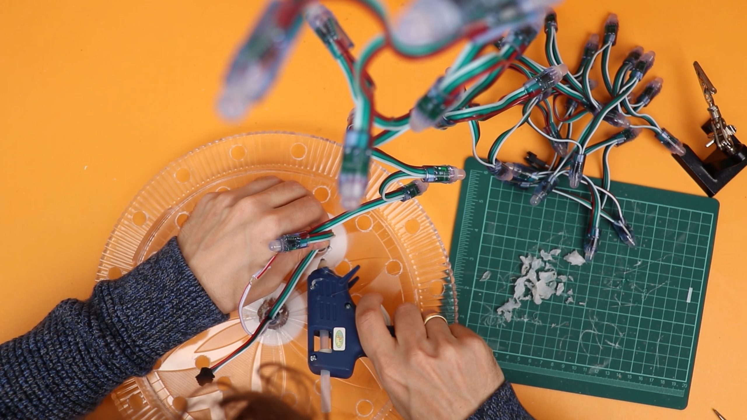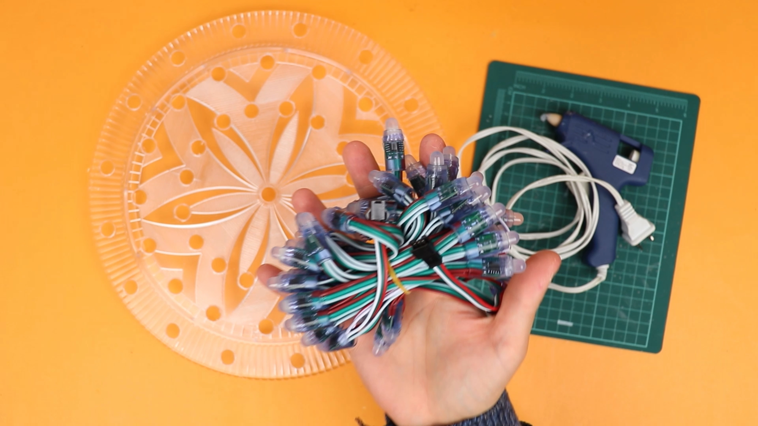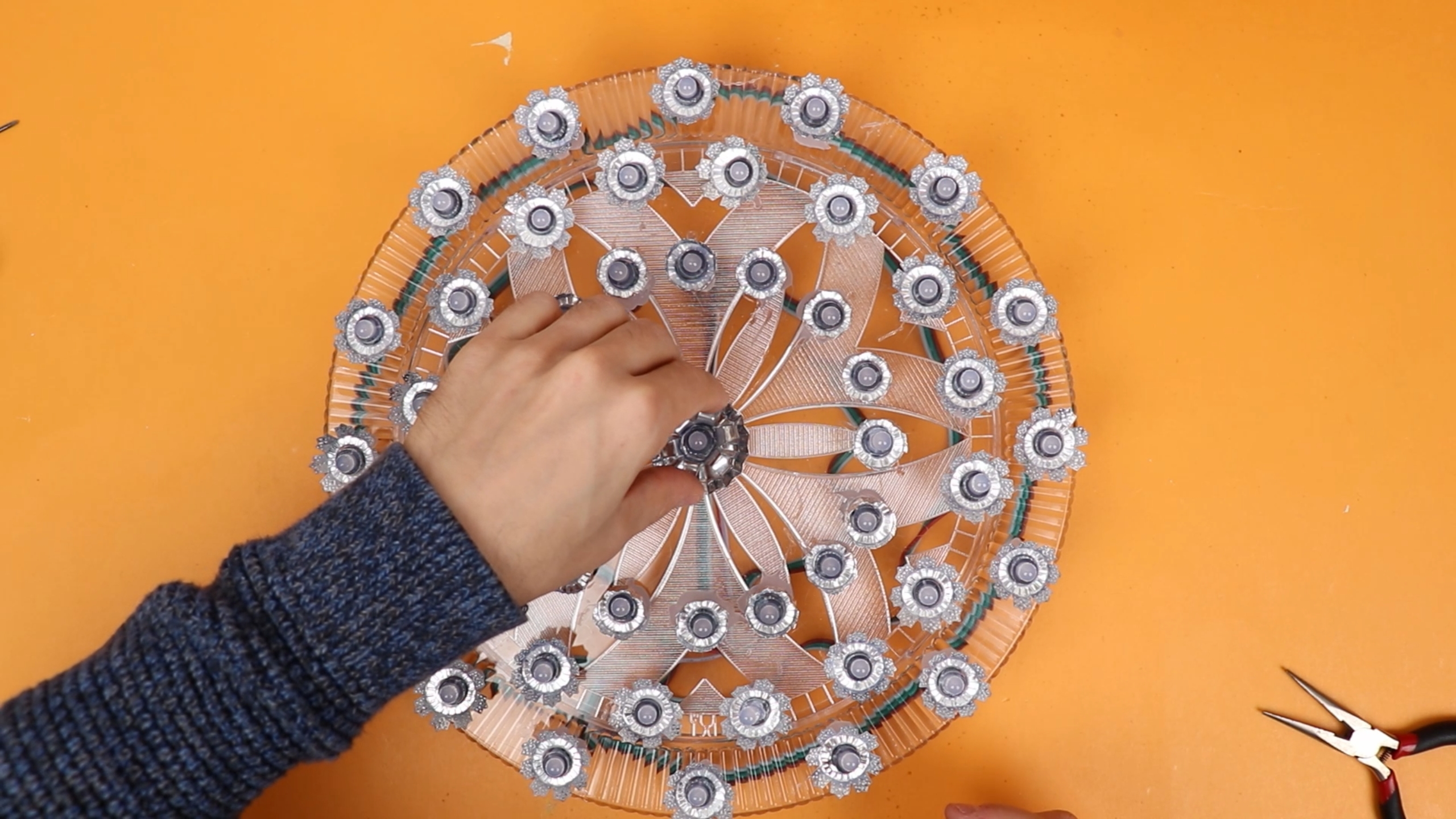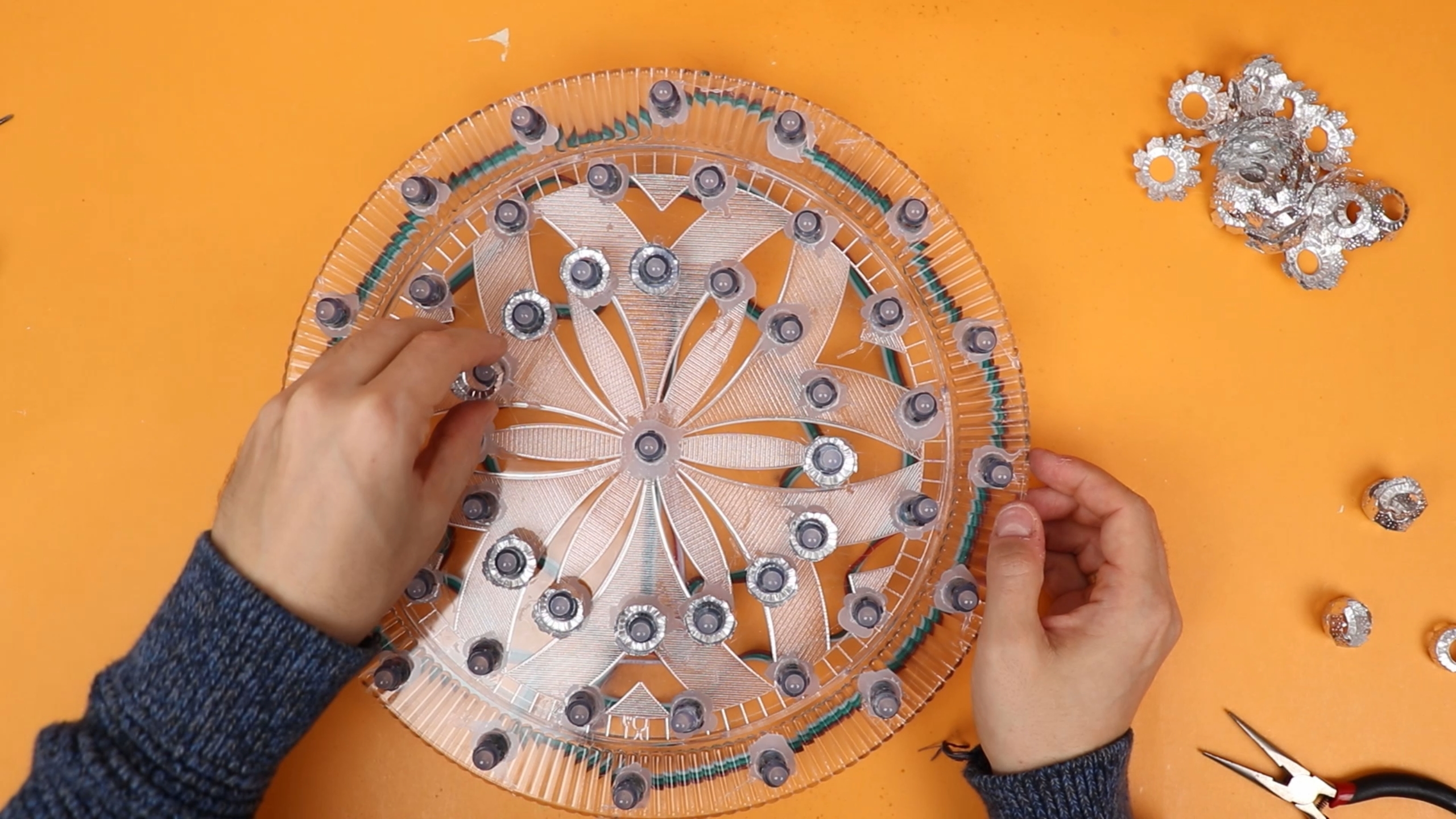 I used hot glue for this, and it took forever because the holes were 13mm and the LEDs are 12mm. But this was not a mistake, we actually need the LEDs to stick out of the plate far enough so that later they don't get covered by the tinsel.