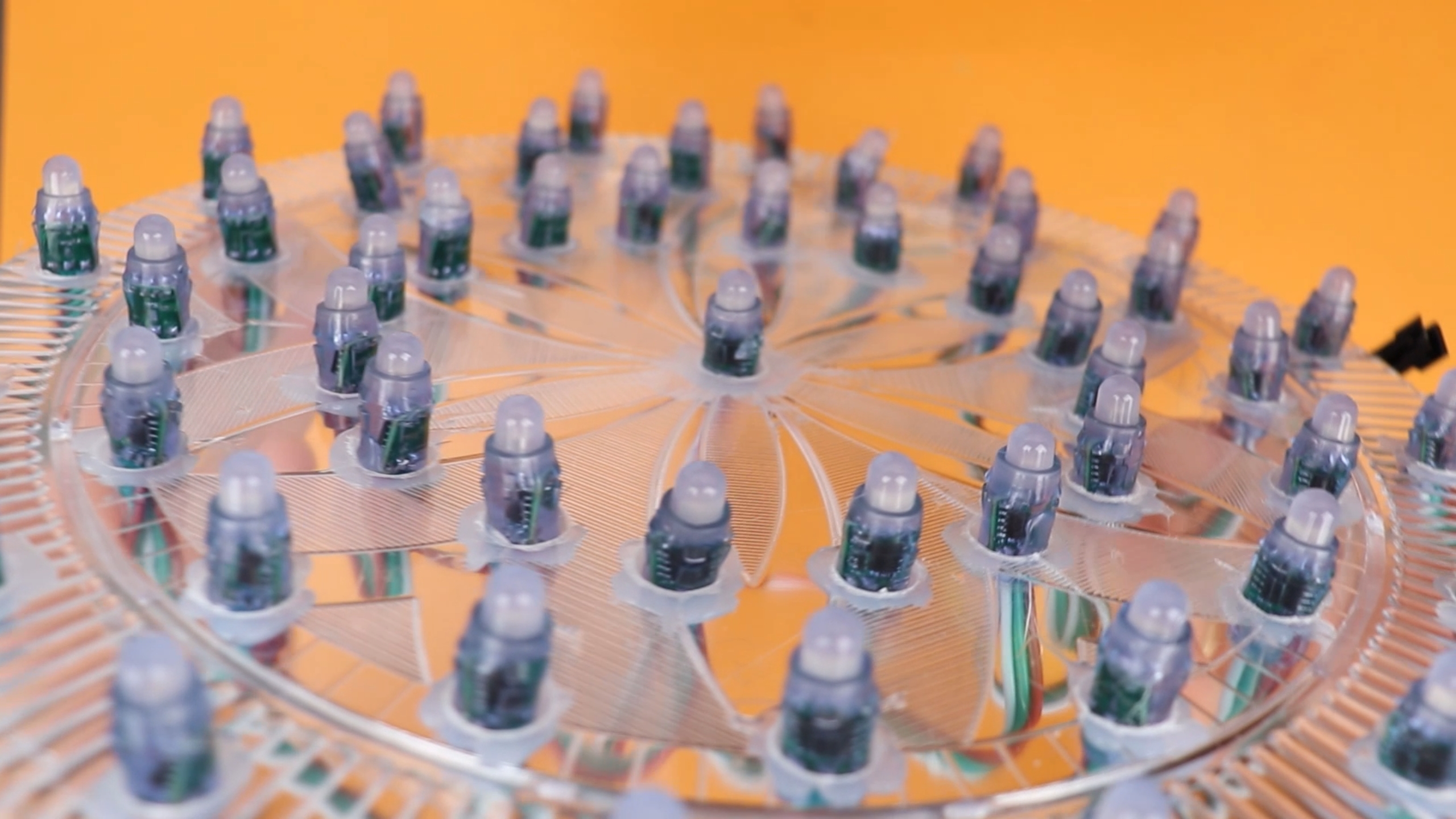 Then we bend them a bit, and then place them on top of the WS2811 NeoPixel LEDs. And here is a small test I made with just three LEDs, but I think you can see this has potential: