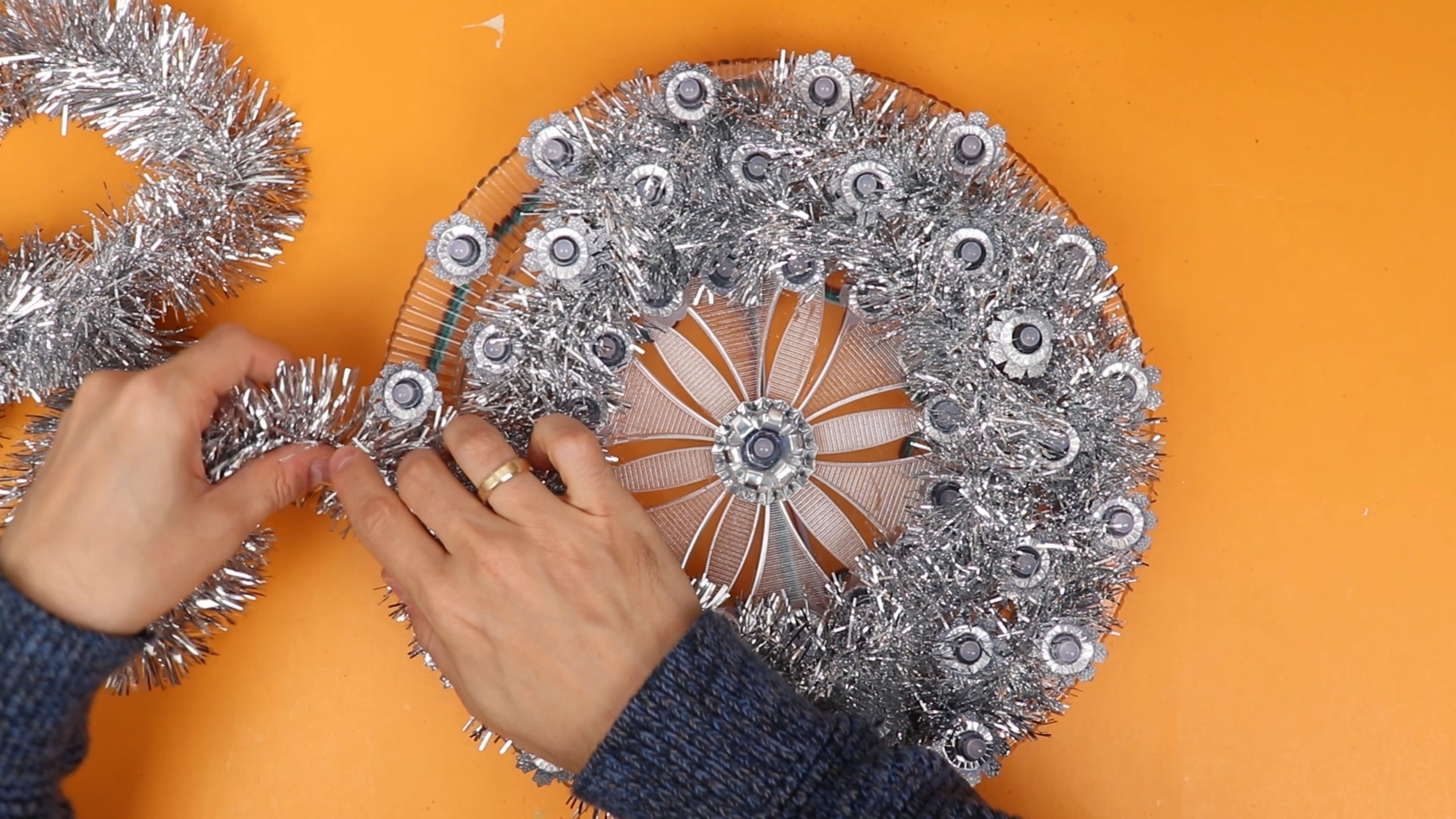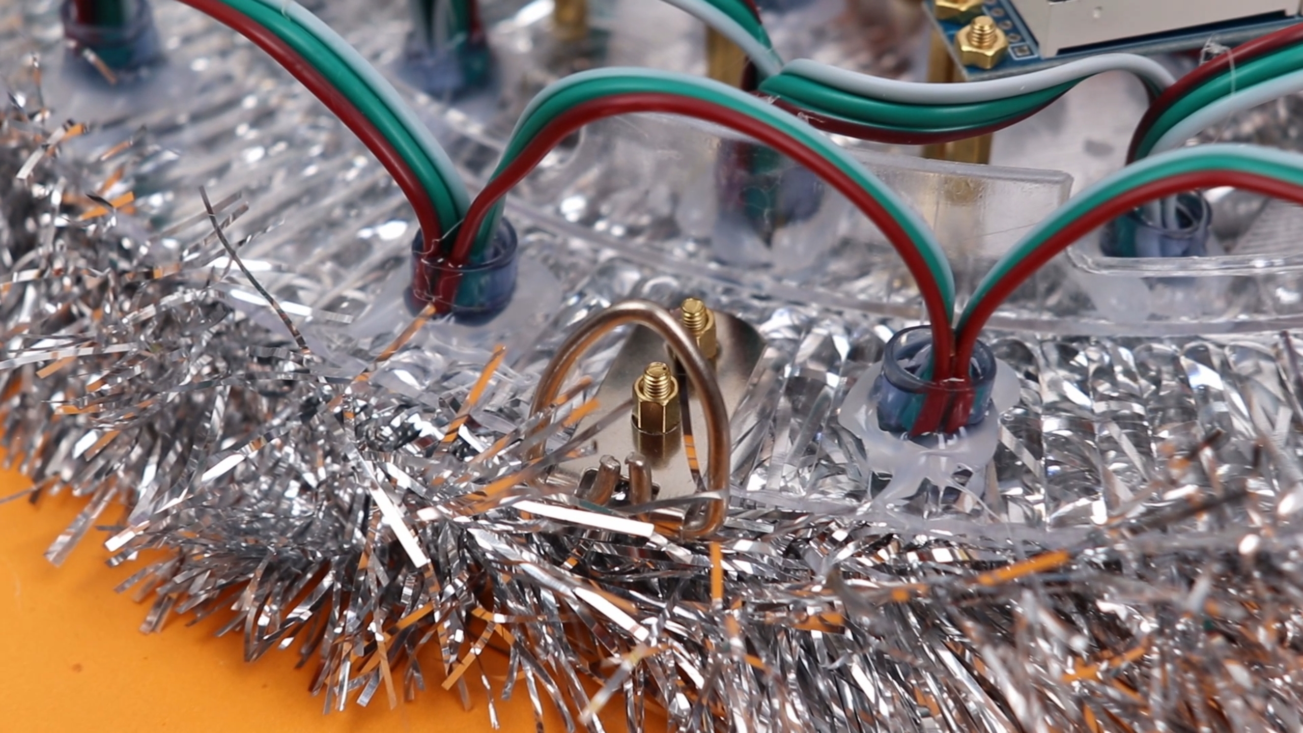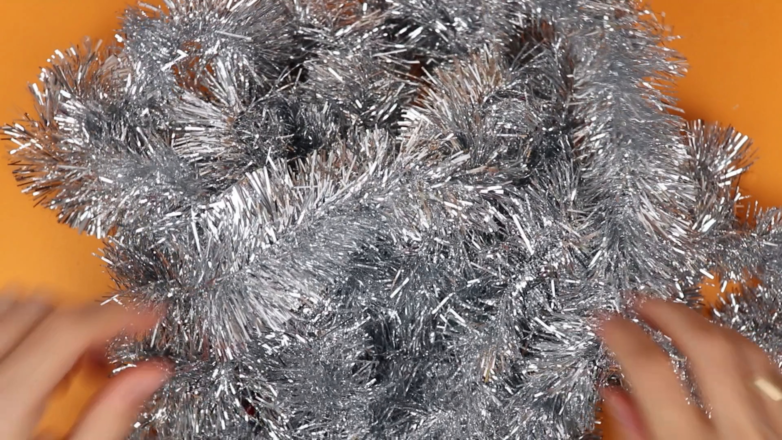 One main ingredient is Christmas tinsel. This is easy to find around Christmas time in just about any decorating store, just make sure you get non-metallic one that is non-conducting. I went for a silver one that works well with virtually any colors: