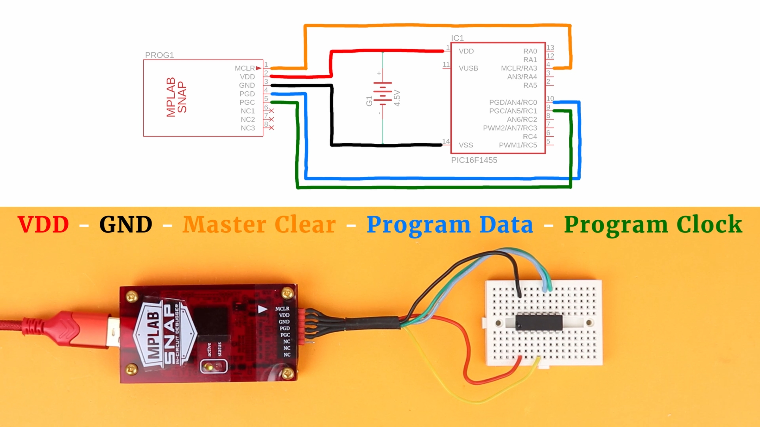 To flash this .hex-file onto the PIC16F1455 with the MPLAB Snap or the PICkit3, place the PIC it on a small breadboard, and connect the MPLAB Snap with the lines VDD, GND, Master Clear, Program Data, and Program Clock:
