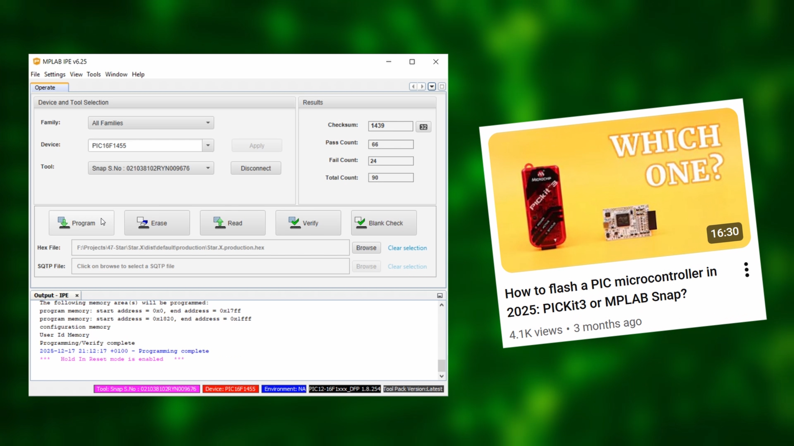 Then don't forget to added a 4.5V battery power supply because the Snap doesn't have built-in one. Inside the MPLAB IPE, we select the .hex-file we just created or downloaded and flash it onto the PIC16F1455: