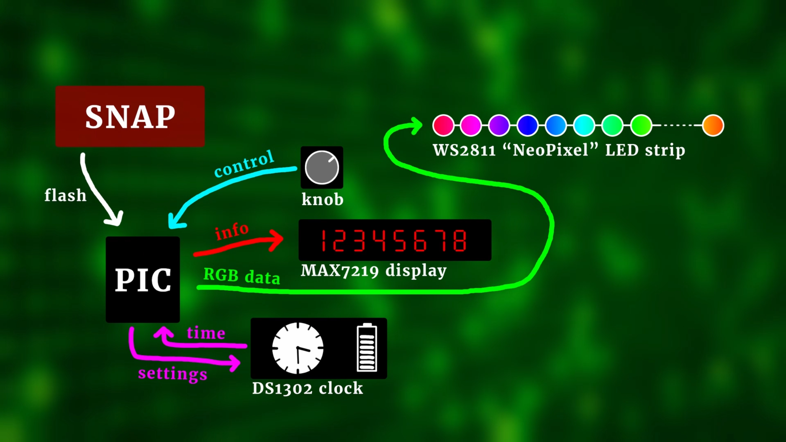 The PIC controls our LED strip by sending out the red, green and blue color data, and we control the settings with a rotary encoder that also has a built-in pushbutton. All settings are shown on the eight-digit 7-segment display. The real-time clock IC provides the time information for the timer that turns our star on and off, and because that chip has a built-in battery we can also use it to store all settings. And we will use the Snap or the PICkit3 as a programmer to flash our program that we will write later onto the PIC microcontroller.