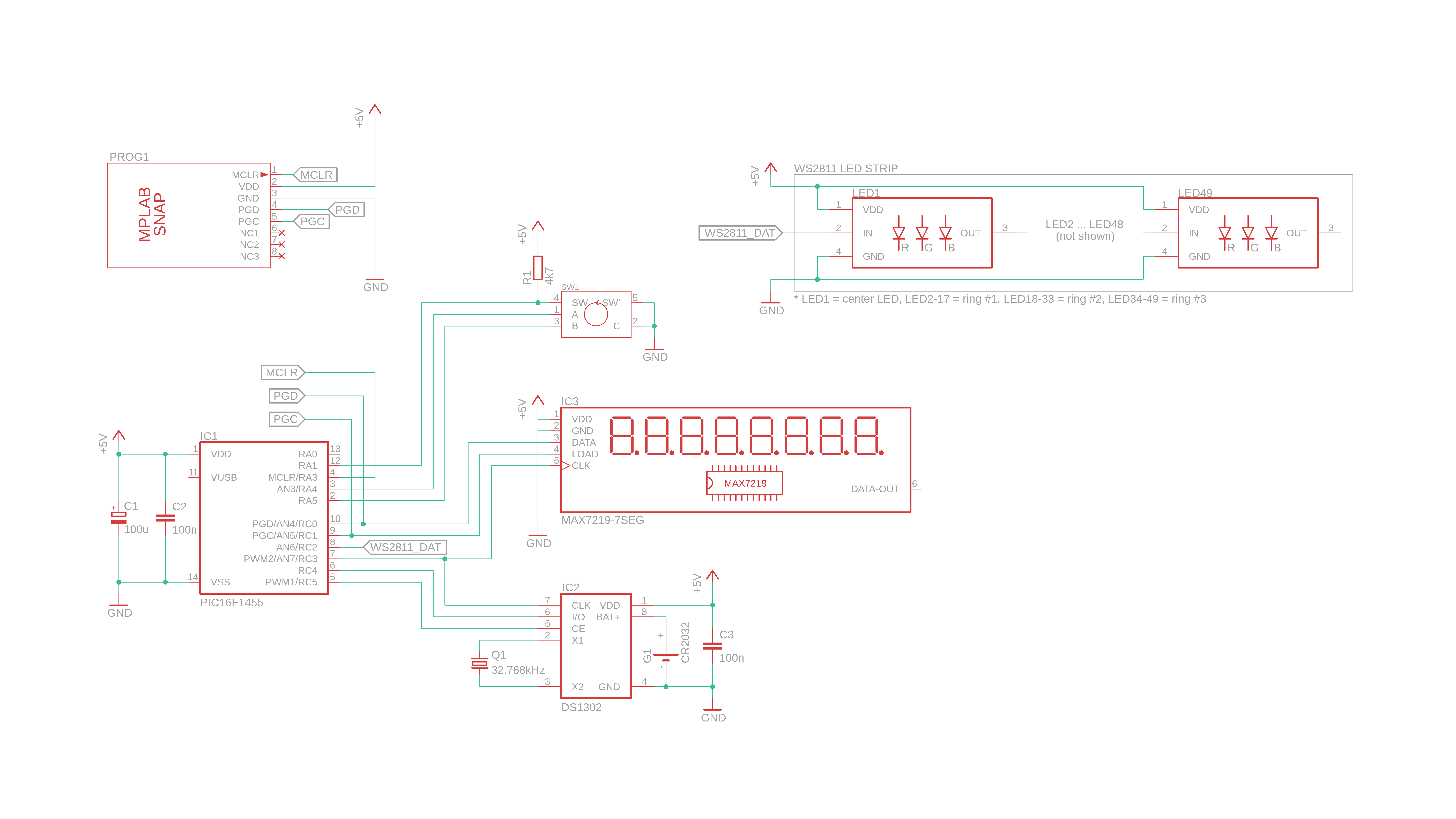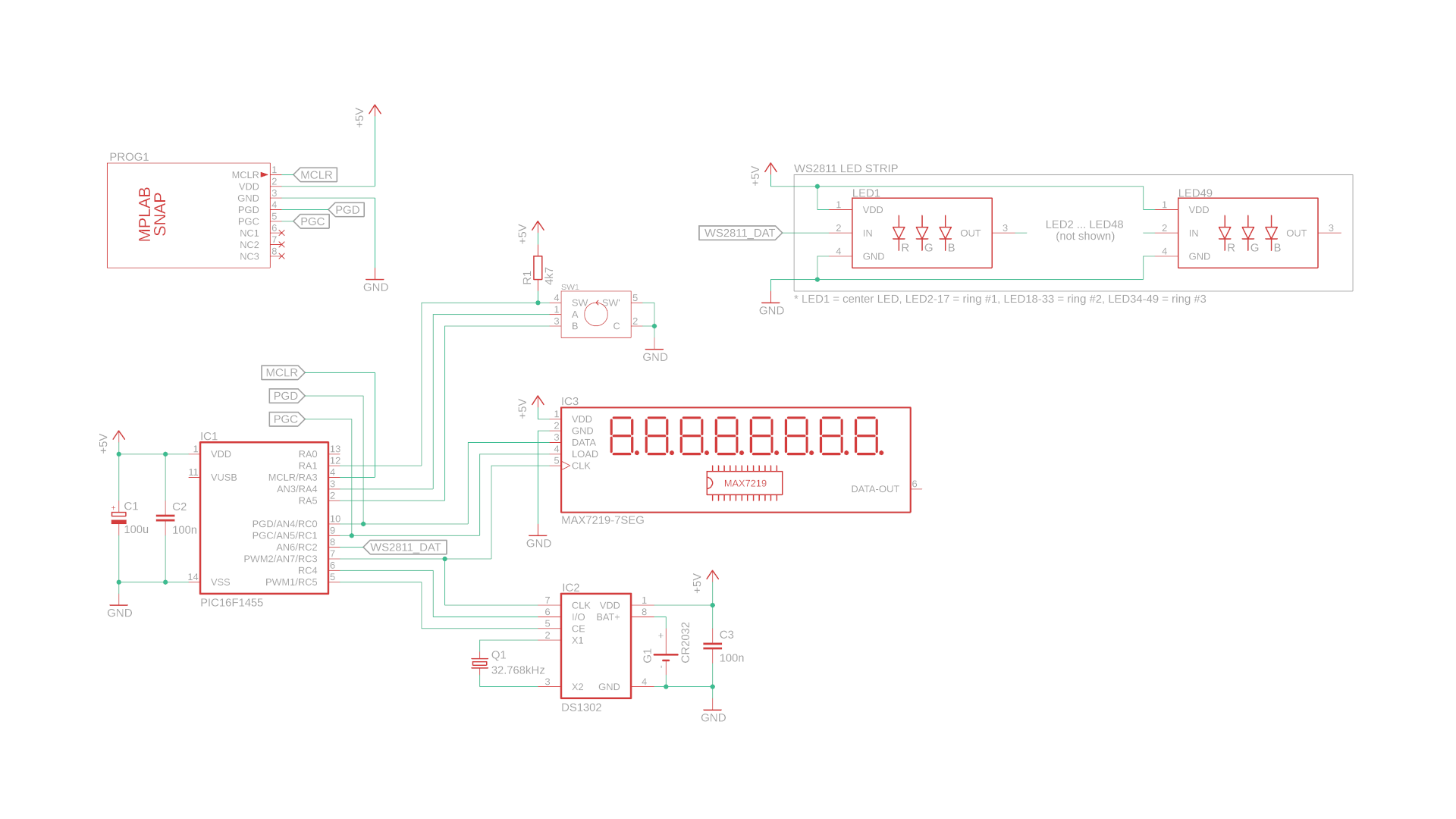- Both the PIC16F1455 and the DS1302 get a 100nF bypass capacitor close to them to remove possible noise on the power supply, and we also add a chunky 100μF capacitor to help prevent power dips when a lot of LEDs turn on all at once.