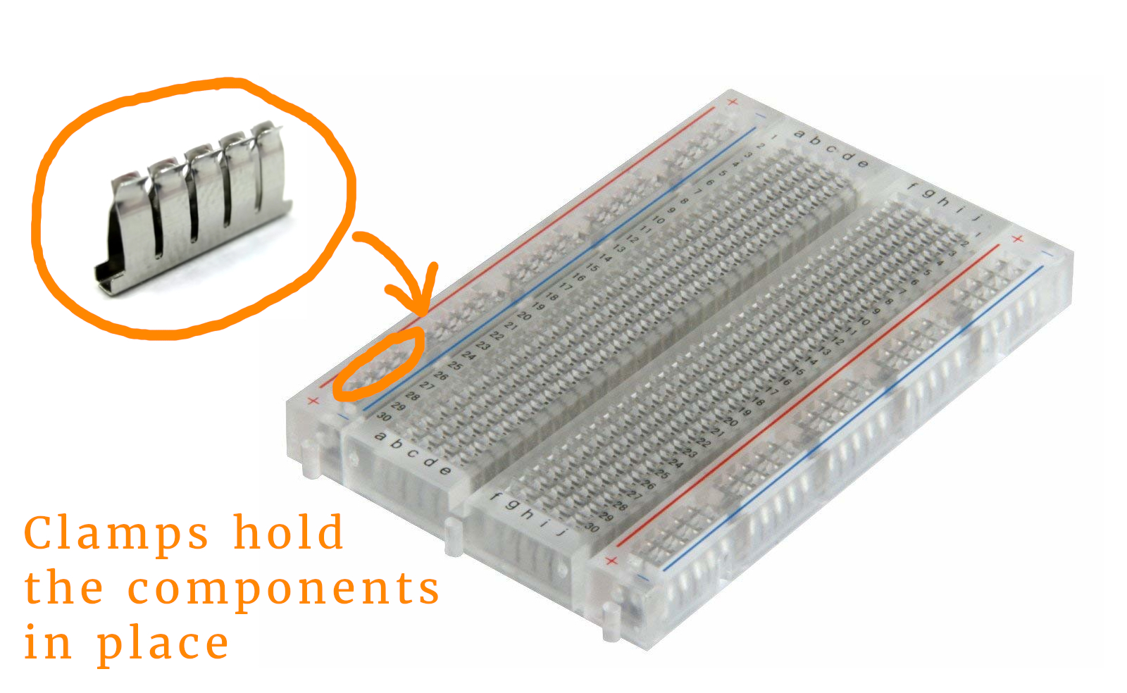 You can plug a cable or component in each of the holes, and they will get clamped in by a tiny metal clamp that is positioned under each hole. There are also transparent breadboards where you can even see these metal clamps. Here is a picture that visualizes this concept: