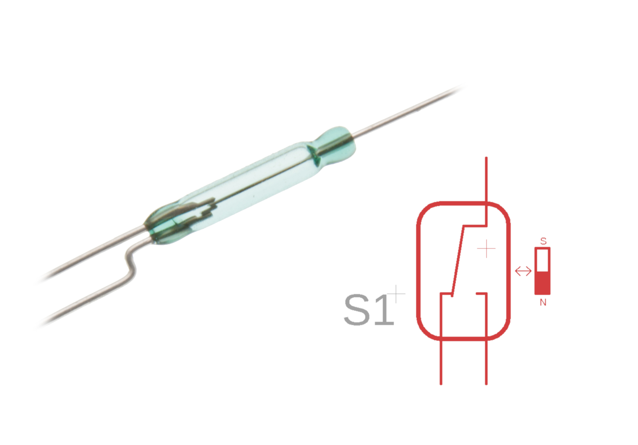 This is a switch that is activated by the presence of a magnet. The thin “reed” is made of paramagnetic, conducting material that switches position when a magnetic field is close by.