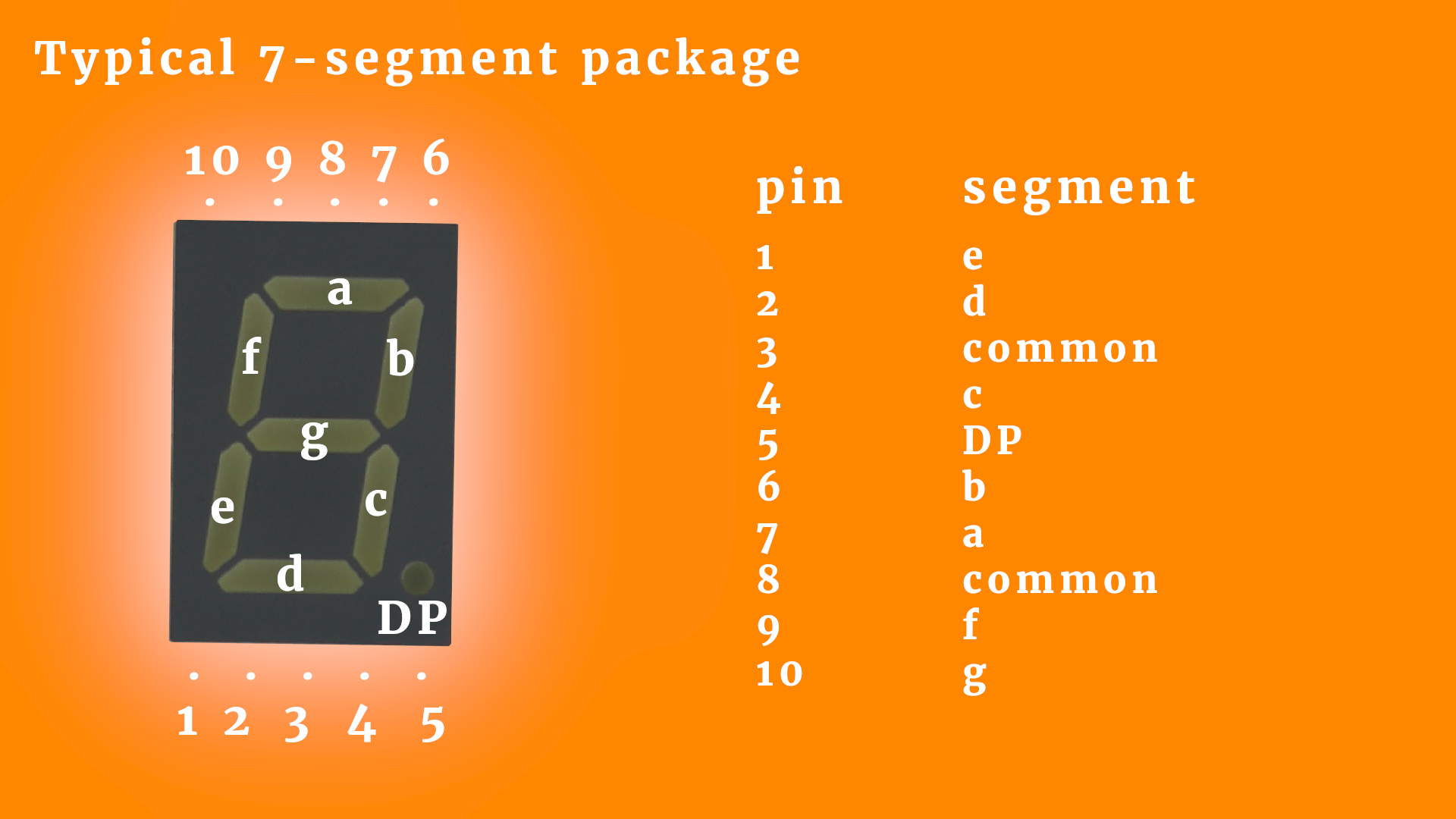 The seven segments are aligned in such a way that they can display all numbers from 0-9 as well as some letters. This is the typical pinout of such a display: