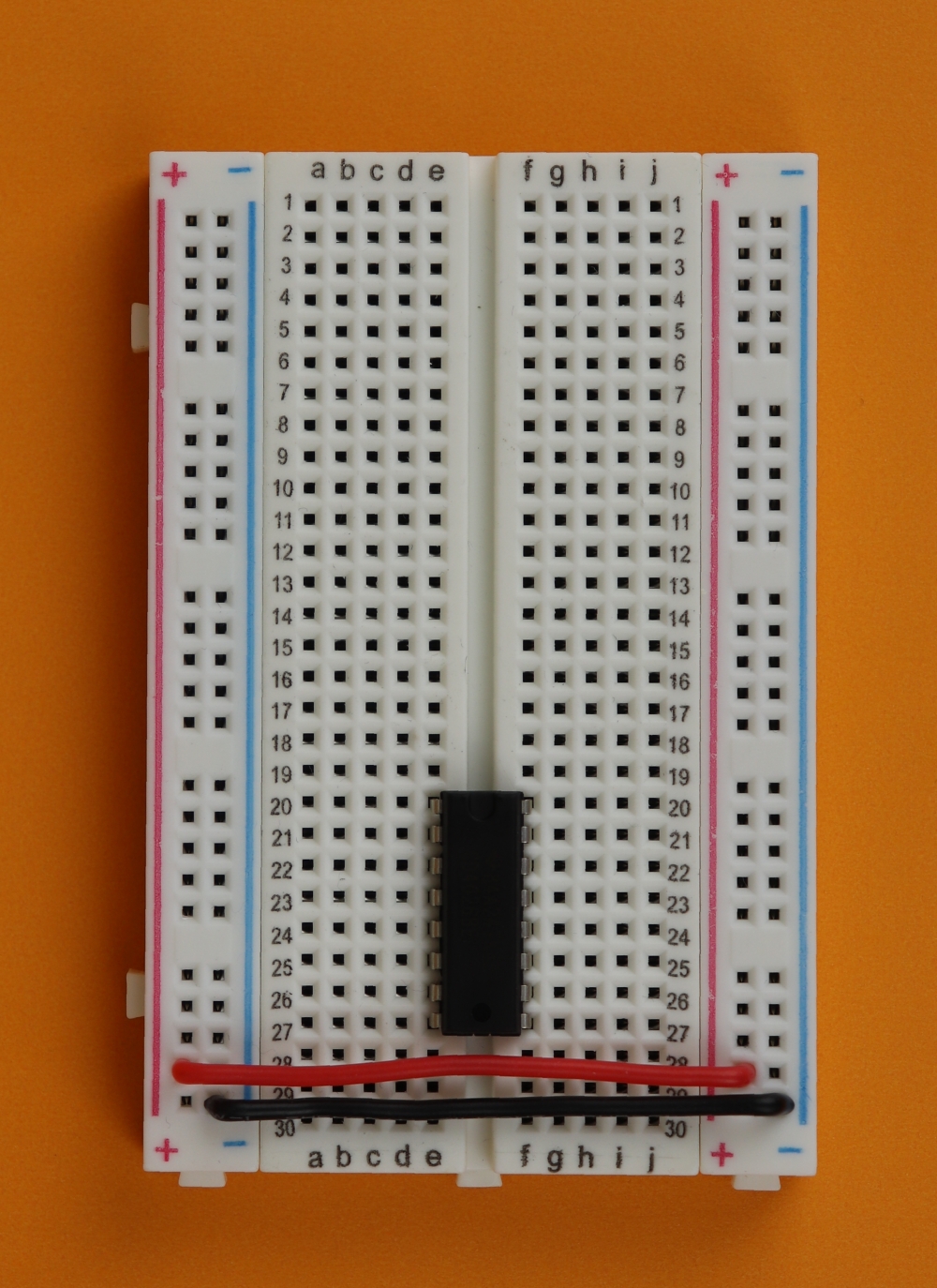 Then place the CD4026 IC in row 20. Make sure that the notch of the IC points up towards the top of the breadboard.