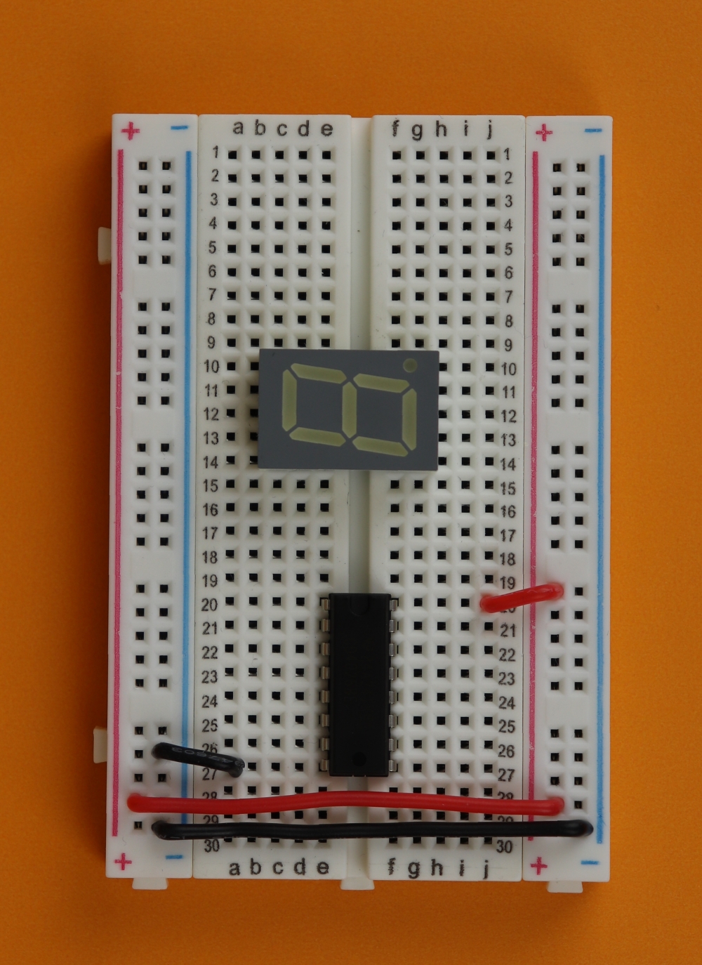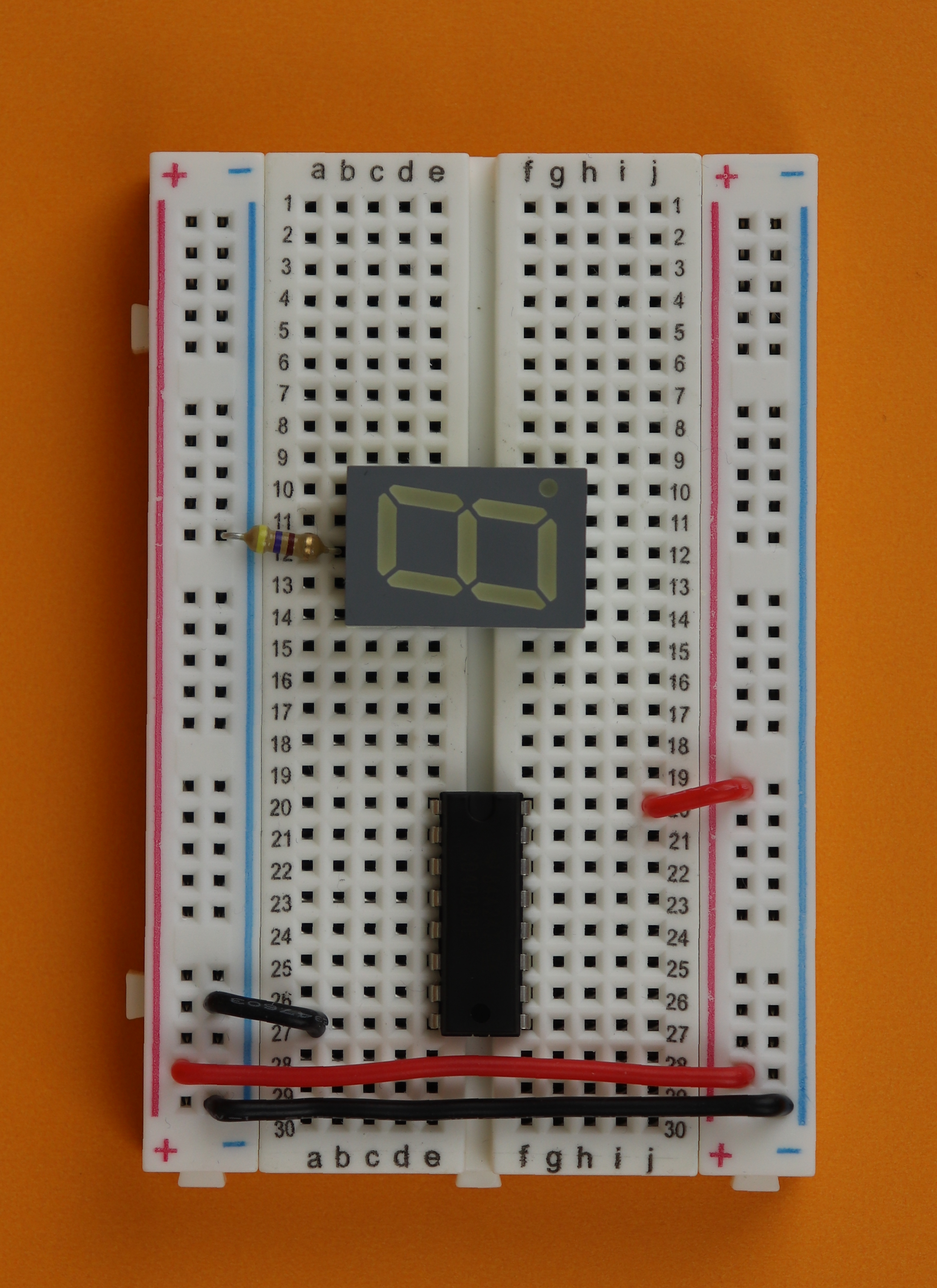 Place the 7-segment display on the breadboard. Make sure it is a common cathode display.