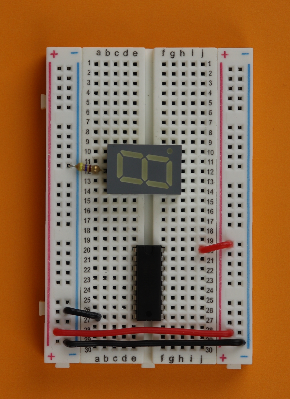 Connect pin 10 of the 7-segment display (row 14, left) to pin 7 of the CD4026 (row 26, left; segment g).